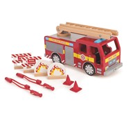 En stor och rejäl brandbil med avtagbart flak där man kan förvara brandslangarna. Med utdragbar stege som kan resas och vridas runt. Taket på förarhytten kan lyftas av och här finns det plats för brandmännen. Av FSC-märkt trä. Från 3 år.