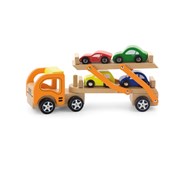 Jättehäftig biltransport i trä med plats för 4 bilar på flaket. Flaket sänks ned och bilarna kan lastas eller lossas. 4 bilar medföljer. Mått: 29x15x8 cm. Av trä. Från 2 år.