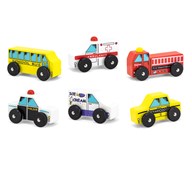 6 st/fp. Olika fordon med rundade kanter och hörn. Hjulen rullar lätt på både golv och mattor. Innehåller skolbuss, ambulans, brandbil, polisbil, taxi och glassbil. Mått: 10x2 cm. PVC-fri. Från 18 månader.