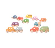 12 st/fp. Färgglada fordon i massivt bokträ, vart och ett med fyra jul samt metallaxlar. Laseringen gör bilarna taktila och ger en sensorisk upplevelse. Blandade modeller, där färgvariationer kan förekomma. Storlek på buss: 11x5x4 cm. Av FSC-märkt trä. PVC-fri. Från 1 år.