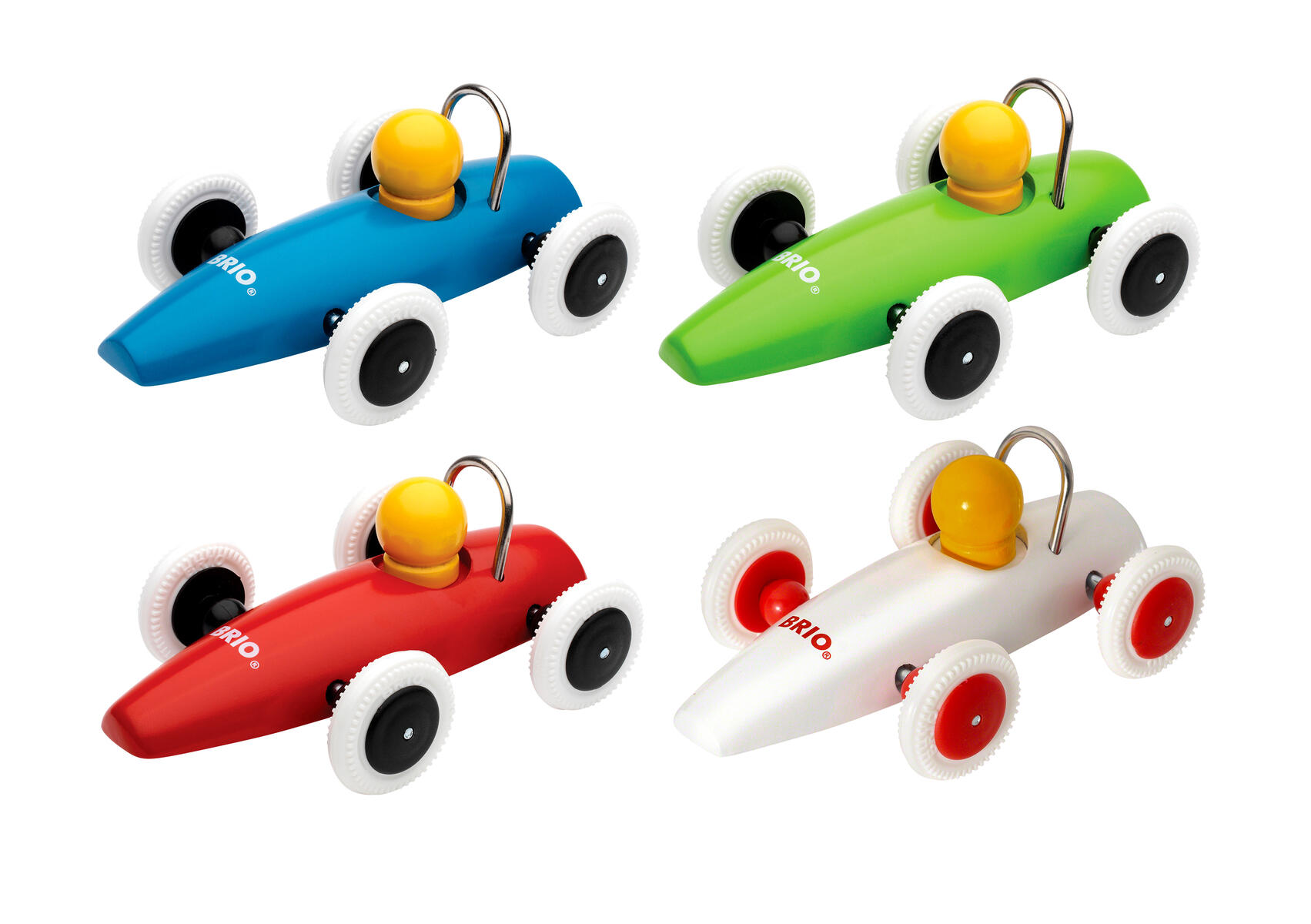 Den klassiska racerbilen i trä från BRIO sätter fart på barn i alla åldrar. Lätt att greppa. Med hjul av PE-EVA för tystare lek. Blandade färger. Av bokträ. PVC-fri. Ca 14 cm. Från 1 år.