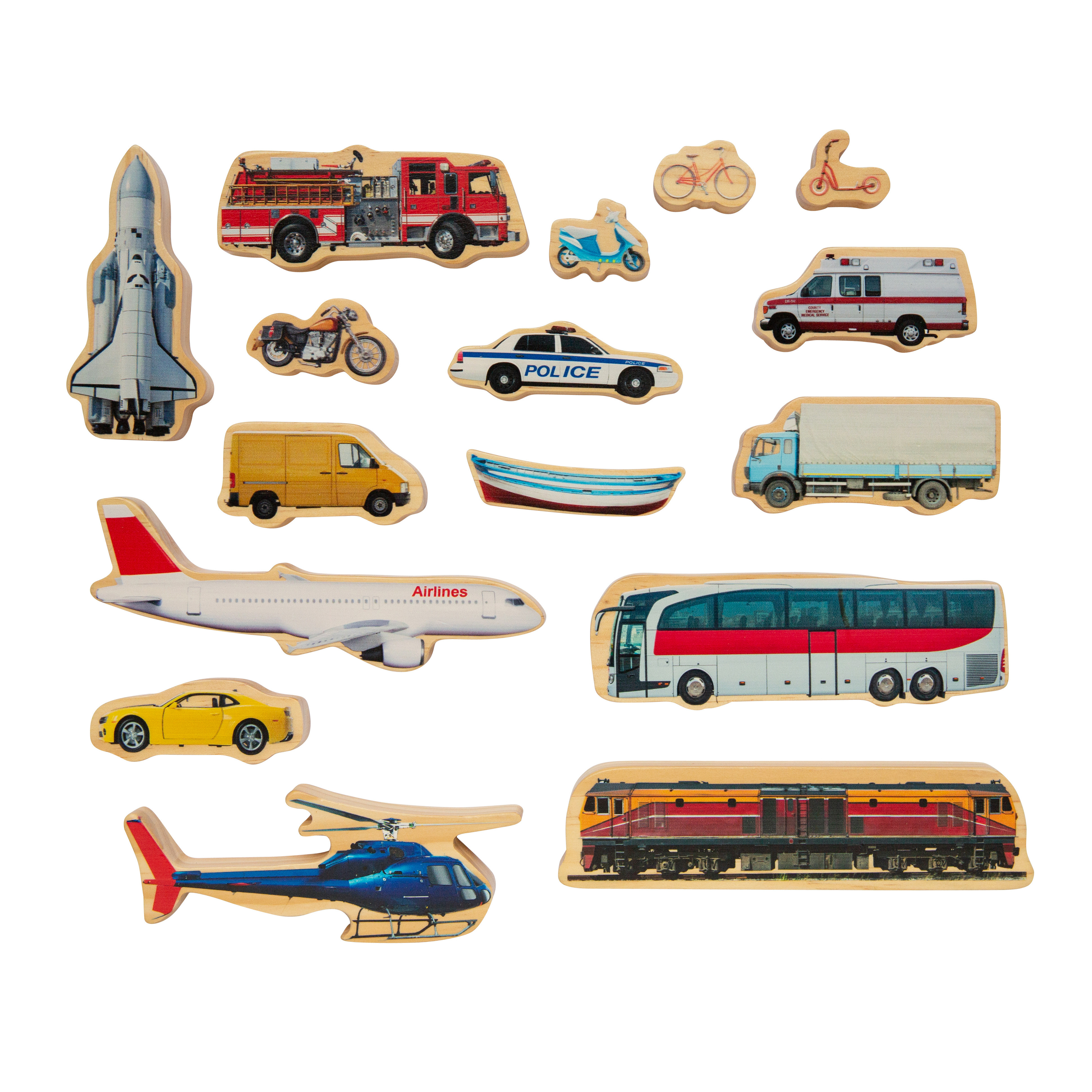 16 delar. Olika fordon, t.ex. skotrar, raketer och brandbilar. Inspirerar barns kreativitet, fantasi och främjar språkinlärning. Varje illustrerad bit är värmeöverföringstryckt för att hålla länge.