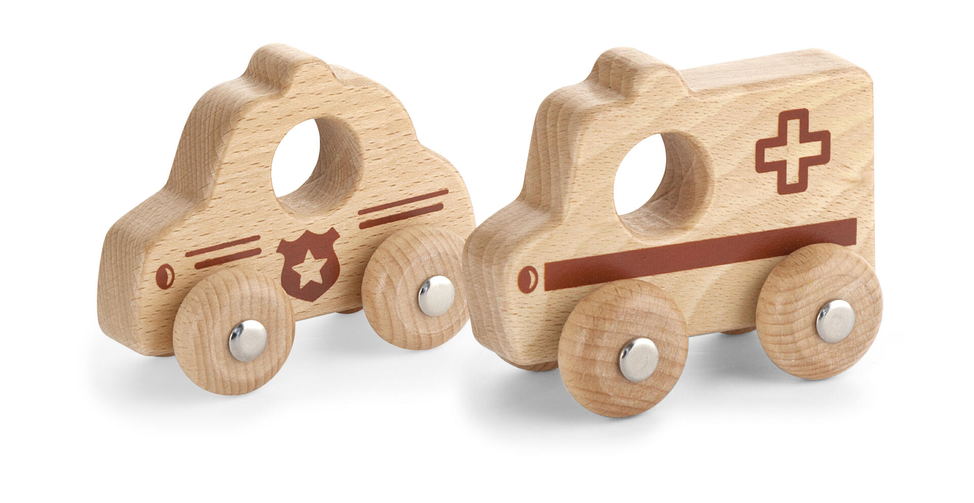 Polisbil och ambulans i FSC-märkt naturfärgat bokträ som är i rätt storlek för små händer att greppa. De har mjuka kurvor och rundade hörn för barnets säkerhet. Mått: 9x7,5x4,3 cm. PVC-fri. Från 18 månader.