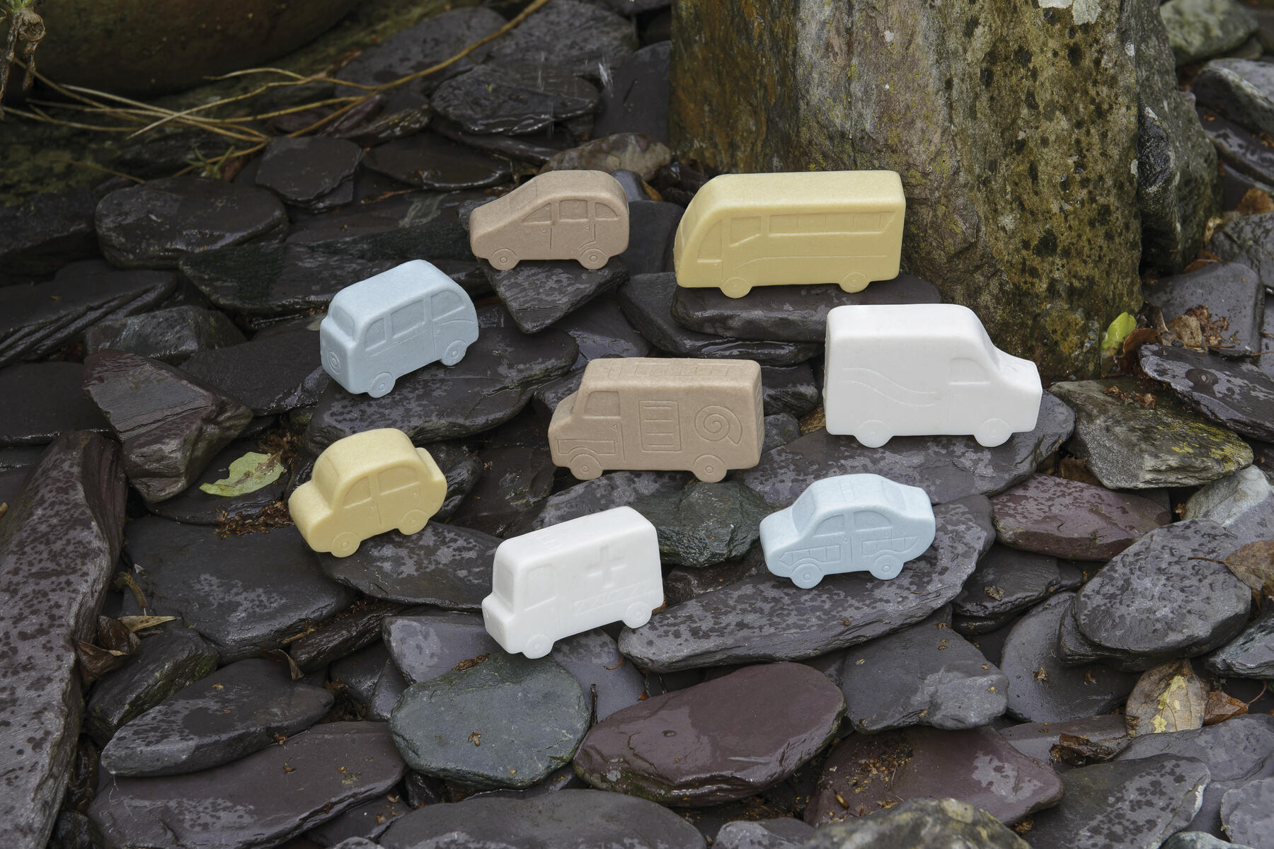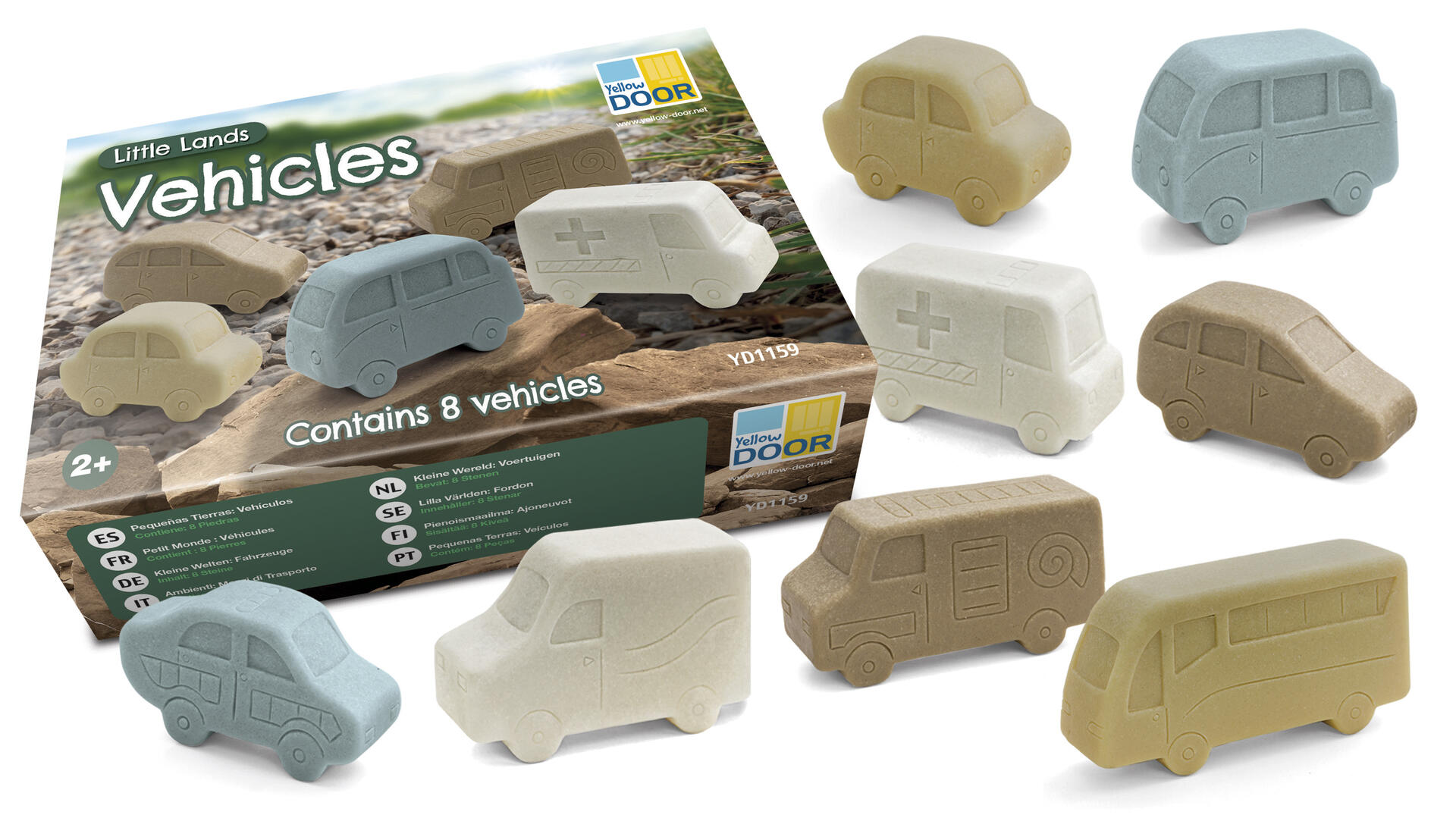 8 st/fp. Fordon av sten som klarar av att vara ute i alla väder. Storlek för små händer och med gravering på varje fordon som visar deras funktioner. Satsen består av: ambulans, husbil, turistbuss, kombibil, brandbil, polisbil, liten bil och skåpbil. Största fordonet är 8 cm. PVC-fri. Från 2 år.