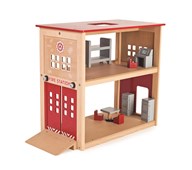 Ett komplett paket med brandstation i 2 plan med möbler, brandbil med utdragbar stege som kan resas och vridas runt och brandmän med böjbara armar och ben. Av trä, brandstation och brandbil av FSC-märkt trä. PVC-fri. Från 3 år.