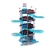Stort parkeringshus med 5 våningar. Garaget har många parkeringsplatser och innehåller dubbla avfartsramper för racing, hiss, bensinpump och biltvätt. 2 metallbilar medföljer. Tillverkad av PP. PVC-fri. Mått: 55x55x84 cm. Från 3 år.