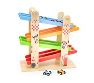 En kul bilbana i trä med 3 medföljande bilar. Släpp bilarna på den översta rampen och se hur de tar sig ned, en rolig leksak för de mindre barnen. Av FSC-märkt trä. PVC-fri. Från 18 månader.