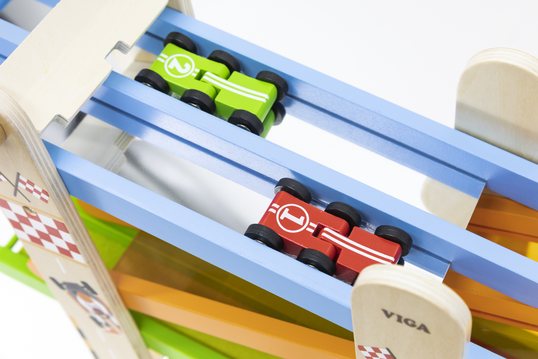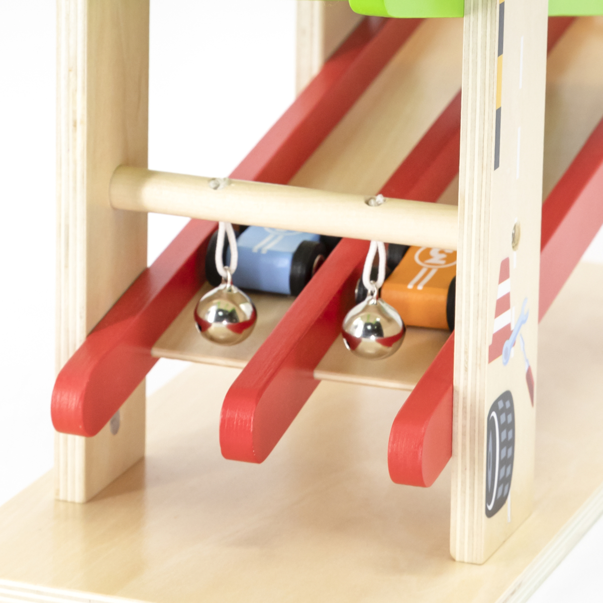 En kul bilbana i trä med 3 medföljande bilar. Släpp bilarna på den översta rampen och se hur de tar sig ned, en rolig leksak för de mindre barnen. Av FSC-märkt trä. PVC-fri. Från 18 månader.