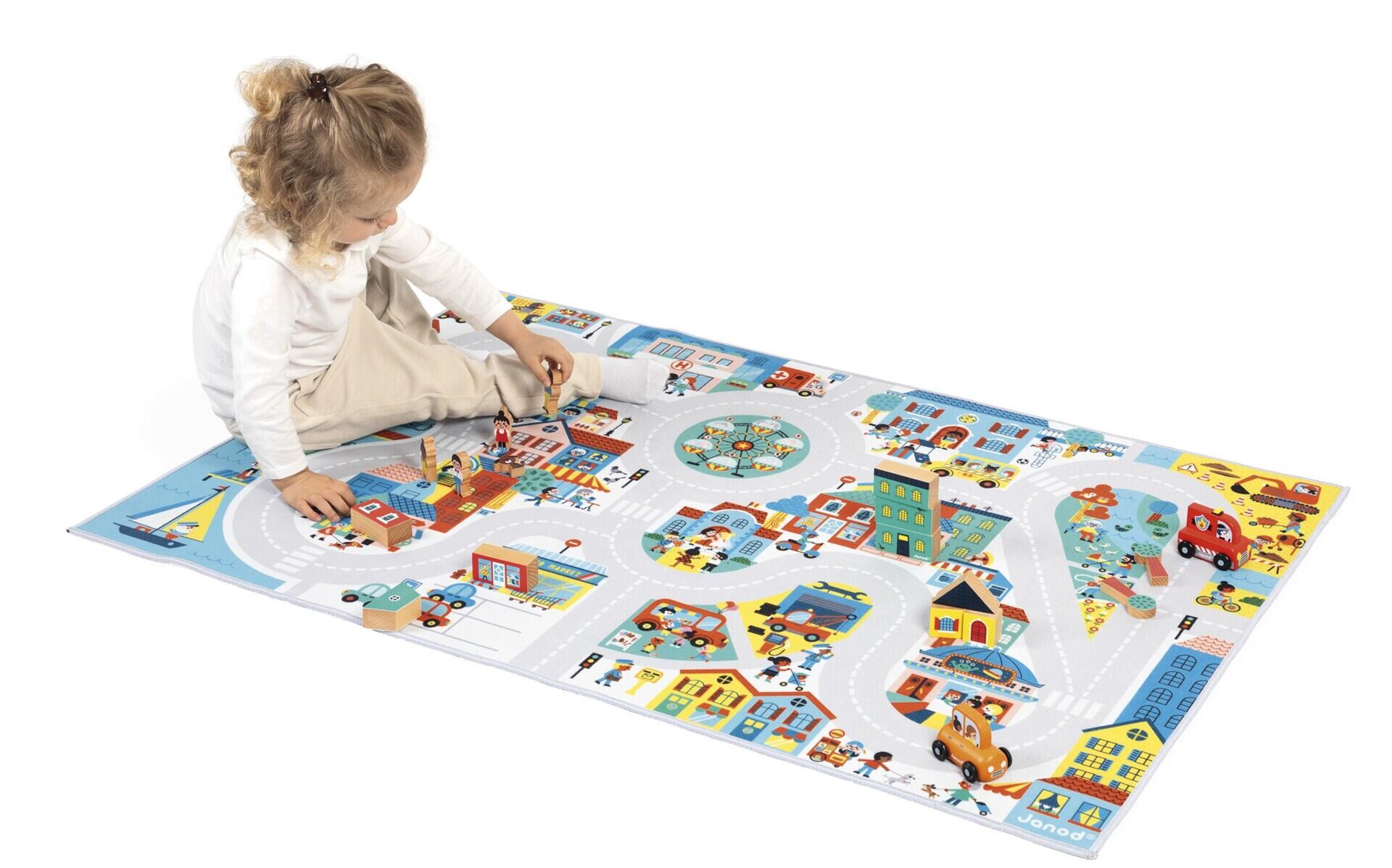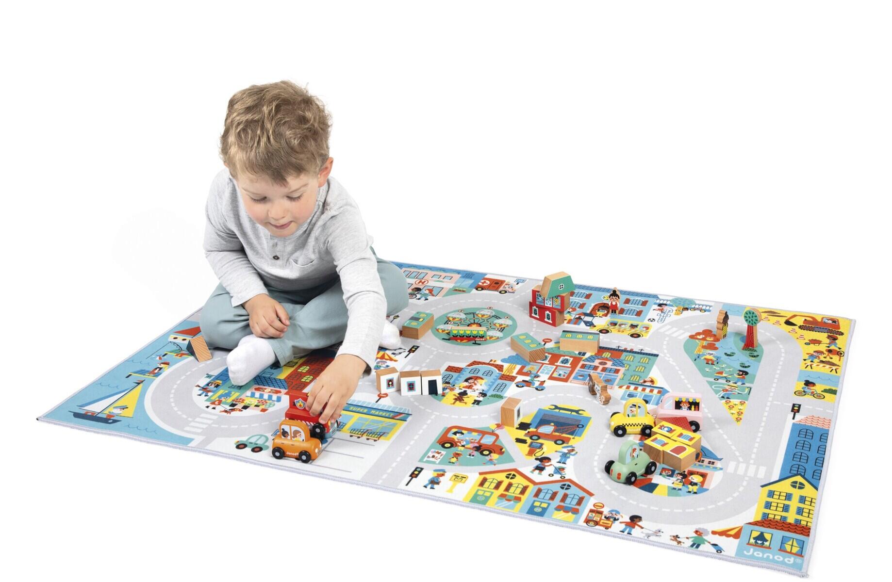 43 delar/fp. På den halkfria lekmattan kan barnen utveckla fantasi, ordförråd och samarbetsförmåga. Innehåller 6 bilar, 5 byggnader, 4 träfigurer, en hund och en katt samt träd och blommor. Lekmattan är tillverkad i polyestermaterial med gummerad undersida. Mått: L78xB120 cm. Mått på bil: 7 cm. Av FSC-märkt trä. PVC-fri. Från 2 år.