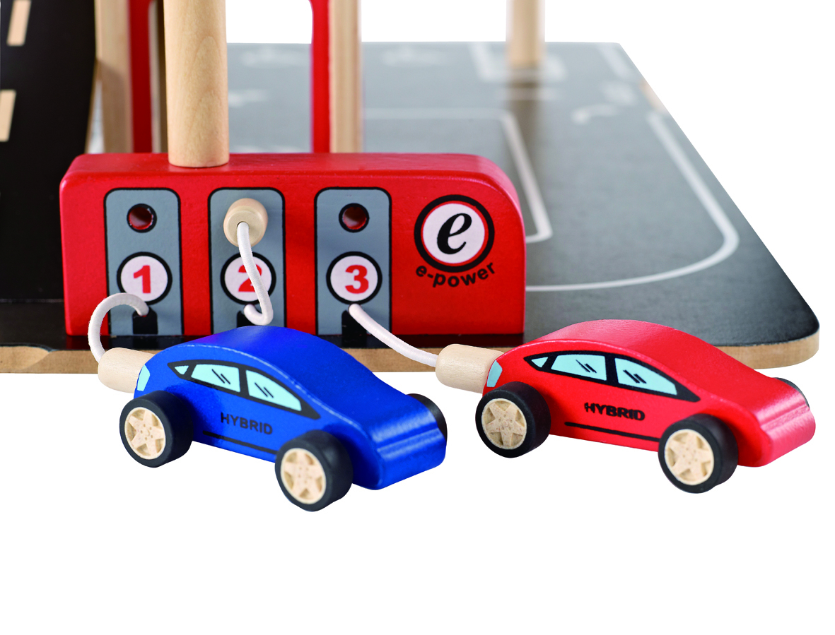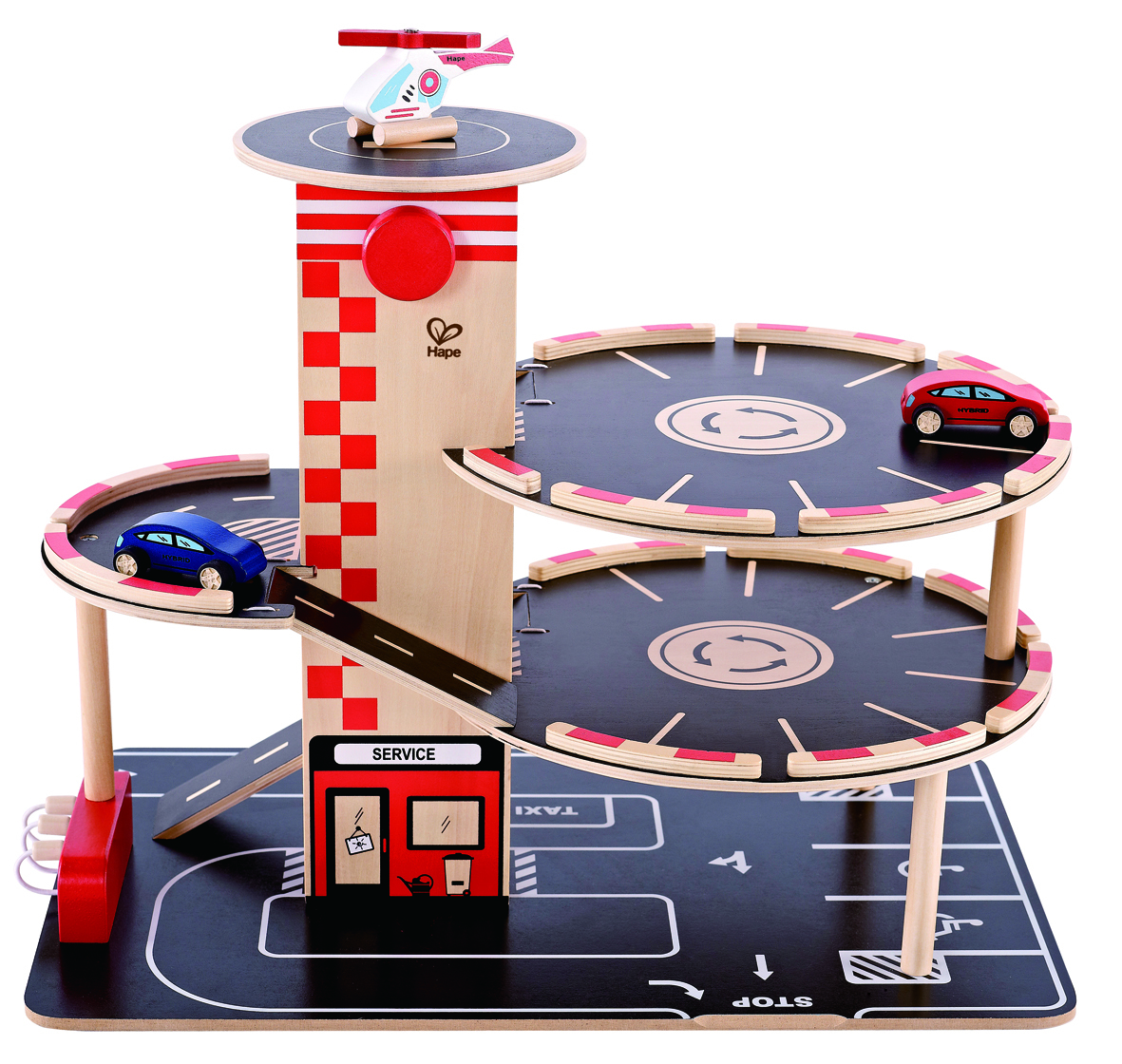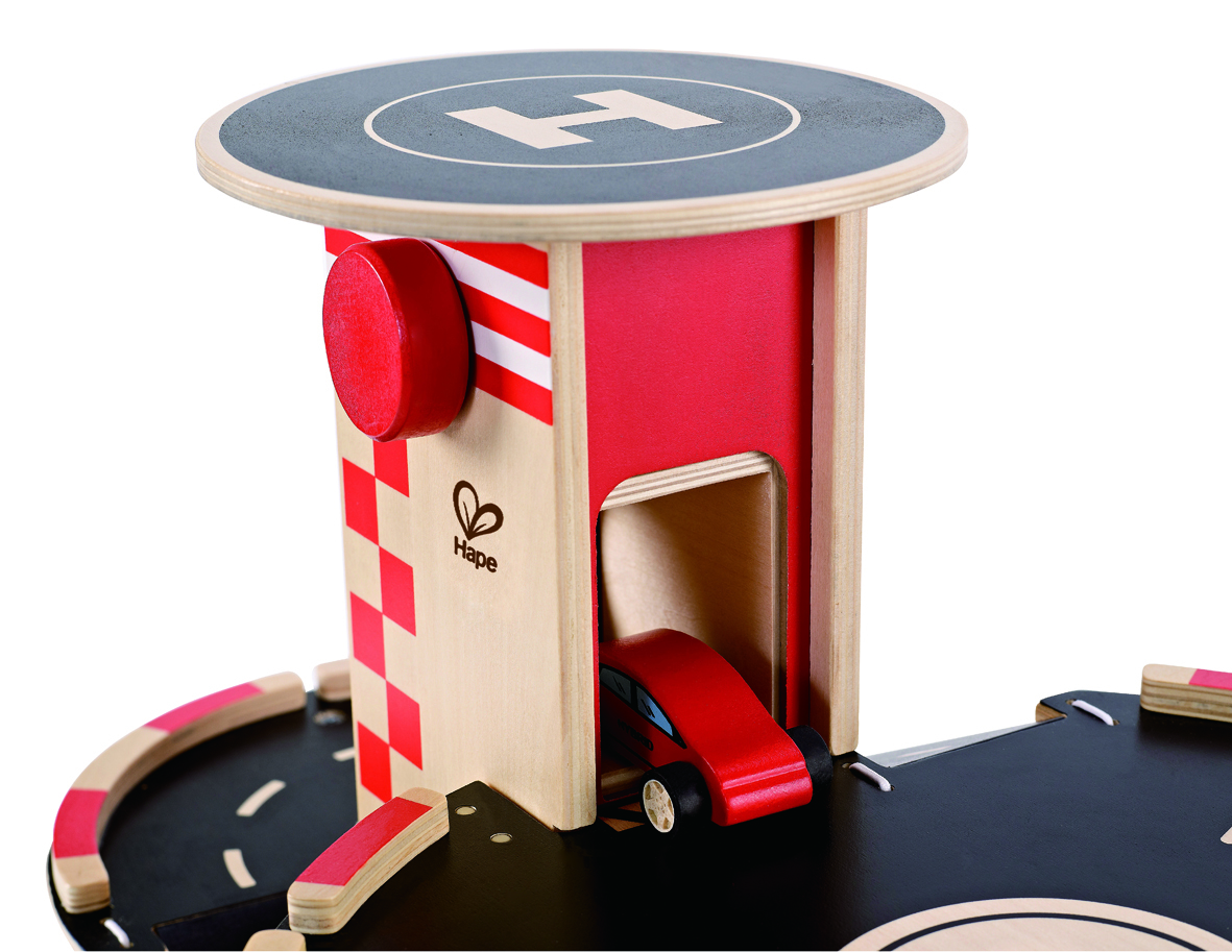 Ett parkeringshus med 3 våningar, biltvätt, bensinpump, hiss, ramp och helikopterplatta. Tre bilar och en helikopter medföljer. Av FSC-märkt trä. PVC-fri. Mått: 55x30x47 cm. Från 3 år.