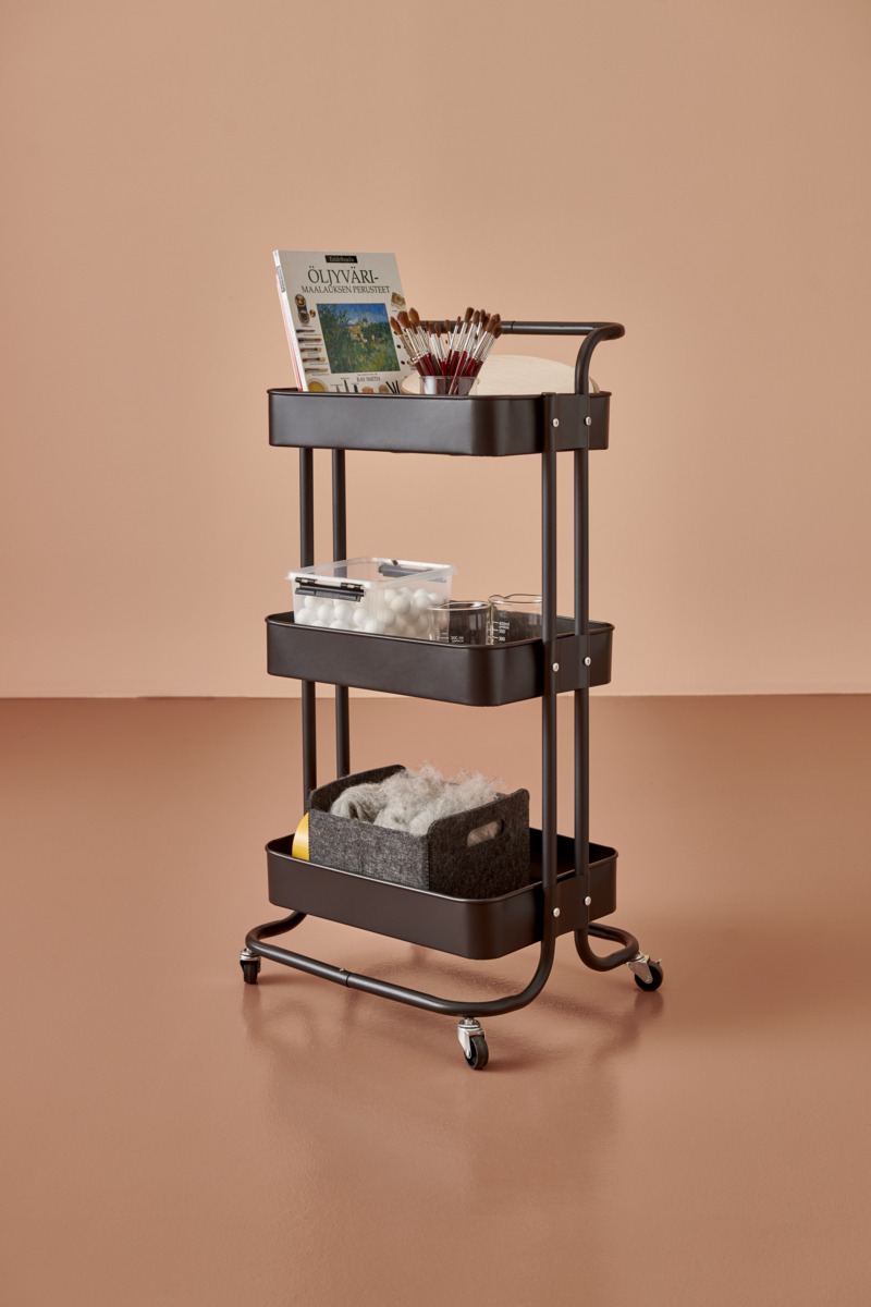 Rullvagn för extraförvaring eller som ett redskap att förflytta saker. 2 låsbara hjul. Mått: höjd till handtag 91 cm, djup 38 cm och bredd 44 cm. Varje hyllplan har ett innermått på ca 29x39x7,5 cm. Av pulverlackad stål och hjul av PP.