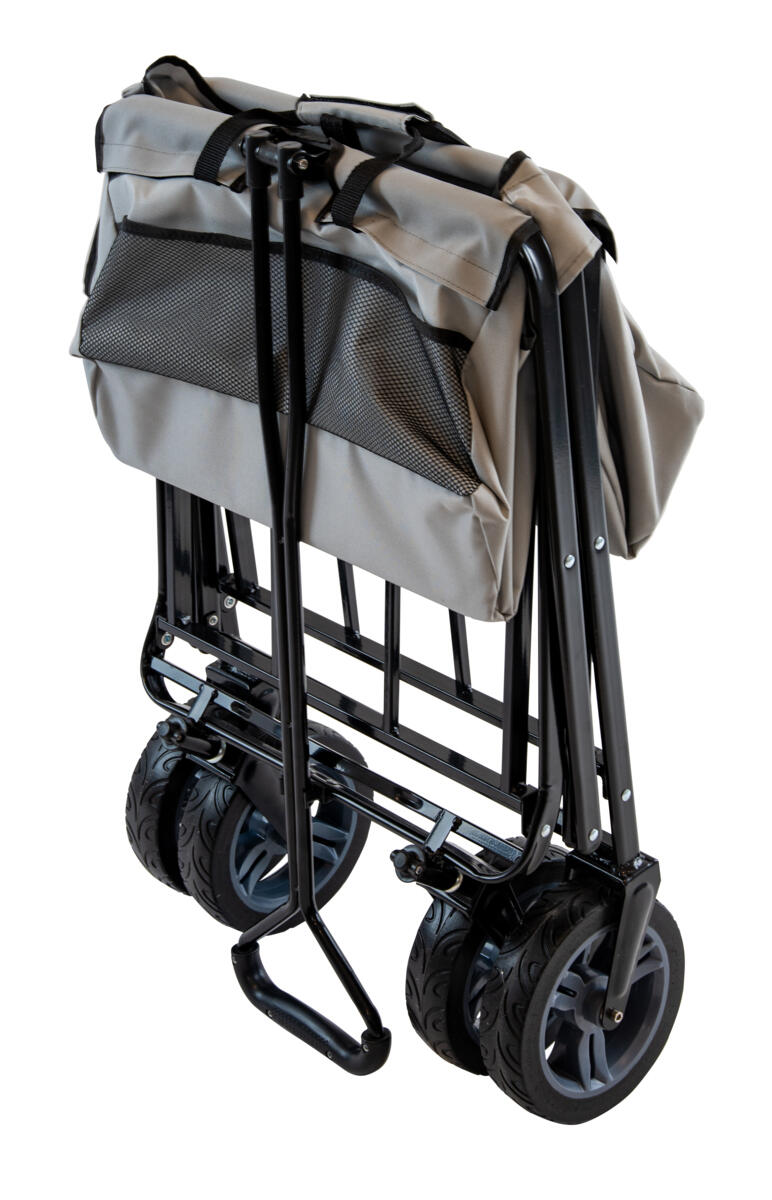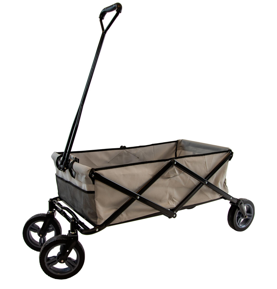En hjälpreda när man behöver ha saker med sig ut på tur (inte avsedd för att köra barn i). Innerskydd, regnskydd och en liten metallbricka medföljer. Handtaget går att koppla loss. Försedd med luftgummihjul. Mått: 113x51x56 cm. Flaket är 90,5x48 cm. Maxvikt: 350 kg. Av stål, PE och polyester.