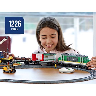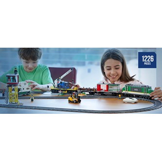 1 226 delar. Bygg upp en tågstation och upplev allt som händer där. Innehåller ett motoriserat lok med Bluetooth-fjärrkontroll med 10 hastigheter, en timmervagn, en kranvagn, en containervagn, ett kontrollcenter, räls och järnvägsväxel, en värdetransportbil och en gaffeltruck. Material: ABS. PVC-fri.