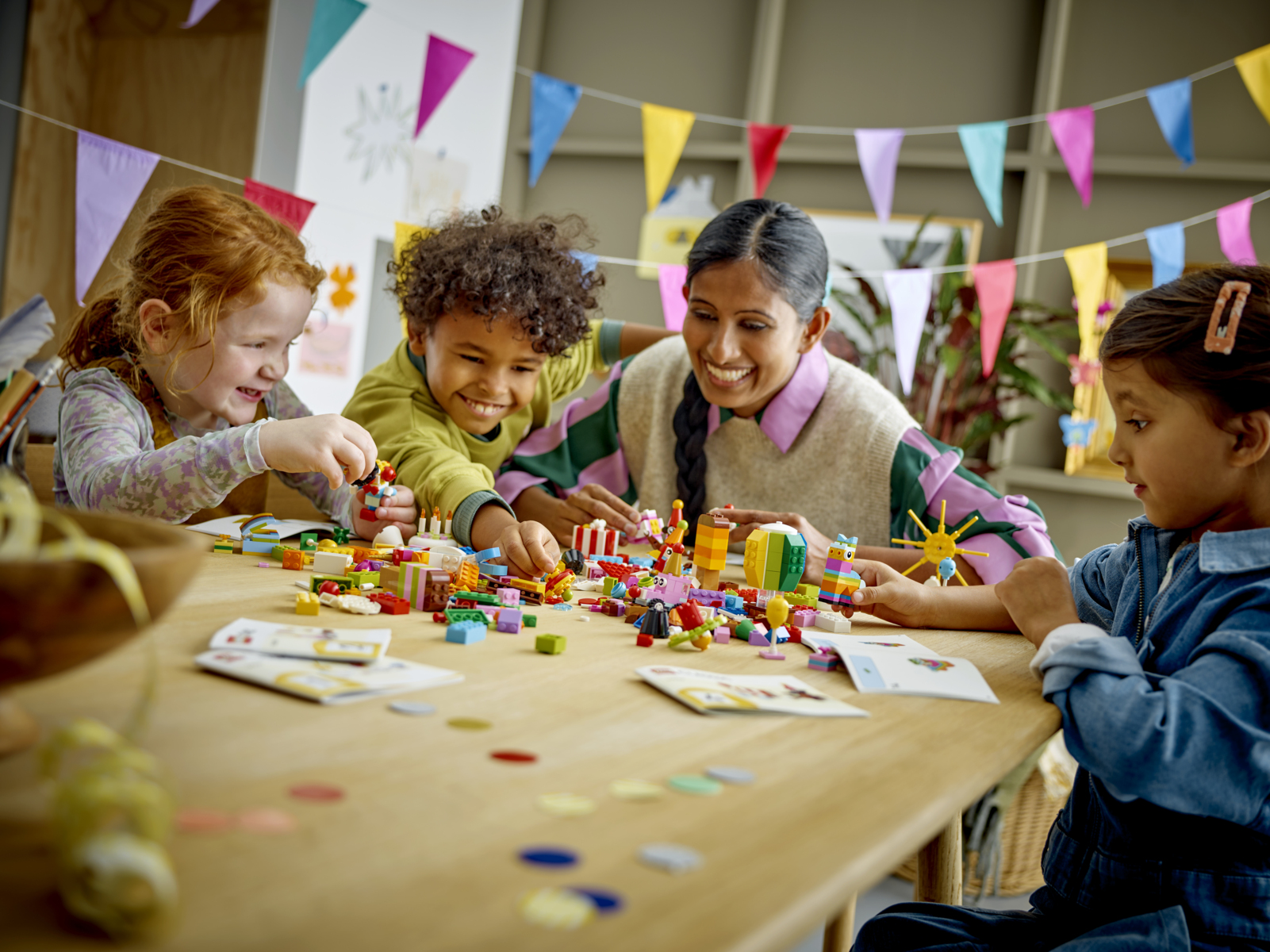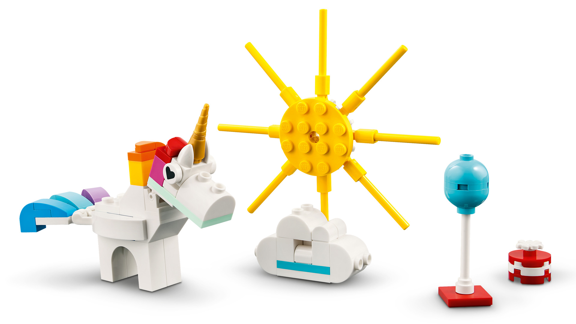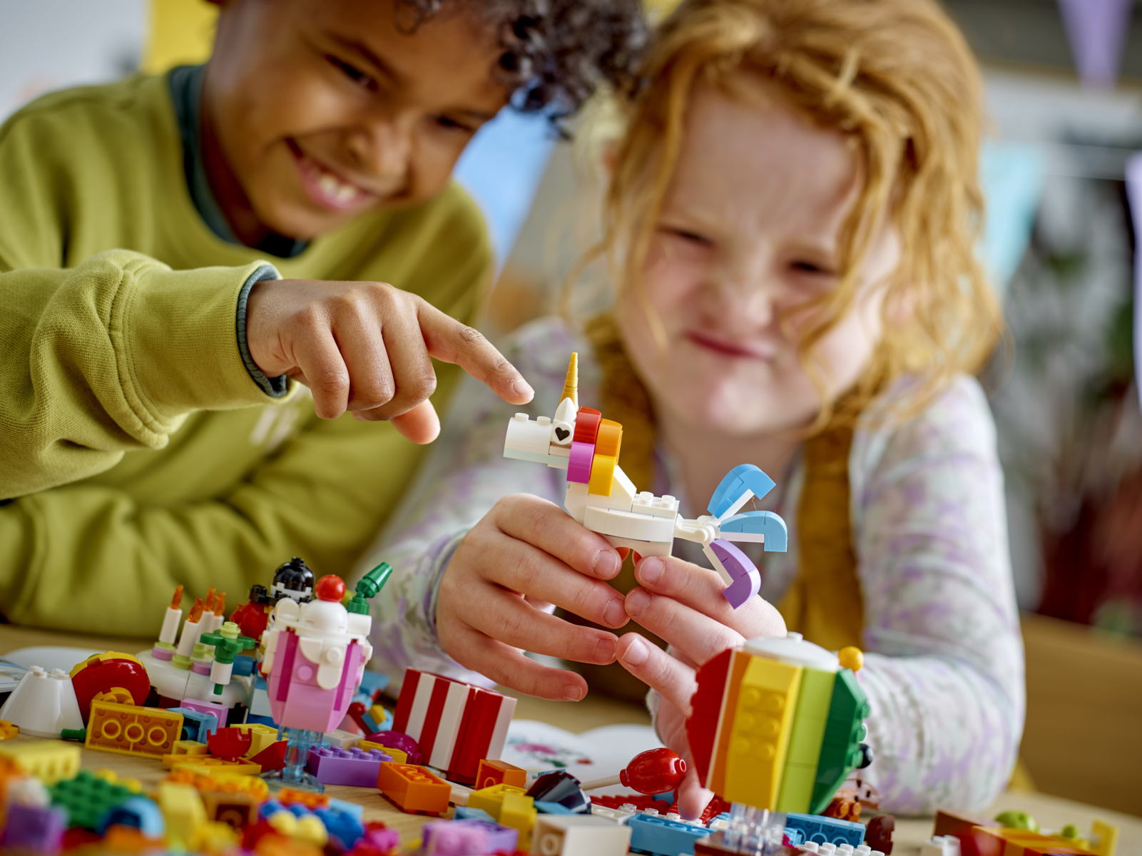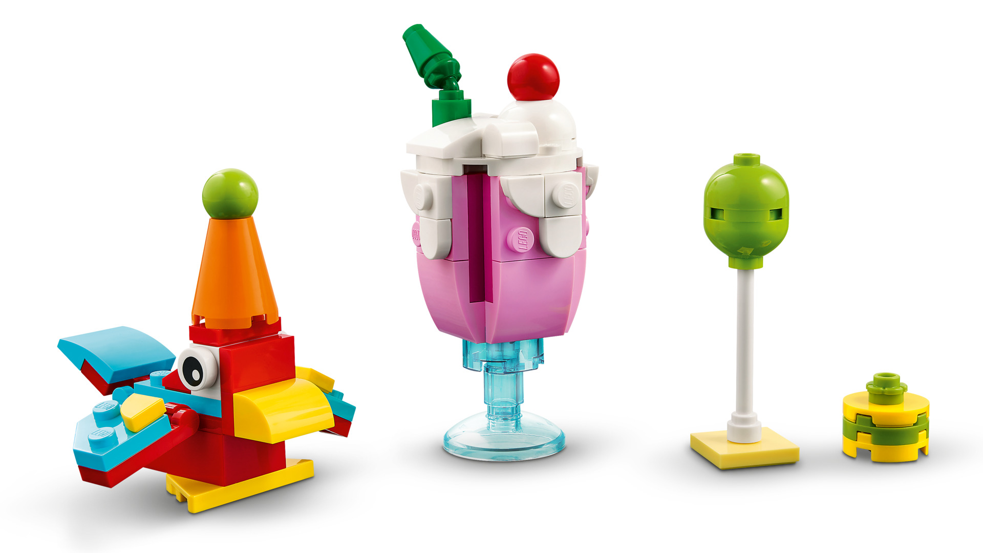 900 delar. Byggklossar i alla regnbågens färger uppdelade i 6 påsar, var och en med delar och instruktioner till 2 lättbyggda modeller: en nallebjörn, en clown, en enhörning, en piñata, en regnbåge, en tårta, popcorn, ballonger och små presenter. Bjuder in till gemensamt skapande för flera barn samtidigt. En digital version av setets bygginstruktioner finns även i gratisappen LEGO Builder. Material: ABS. PVC-fri. Från 5 år.
