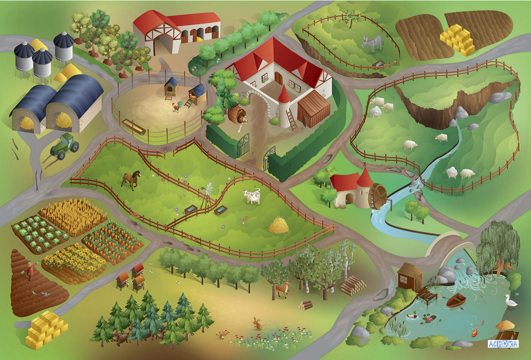 En härlig bondgårdsmatta som inspirerar till lek med djur, bilar och figurer. Genom en speciell vävteknik får mattan en annorlunda ytstruktur med 3-dimensionell effekt. Av polyester och bomull. Räfflad undersida, ej antiglid. Djur och tillbehör ingår ej. PVC-fri.