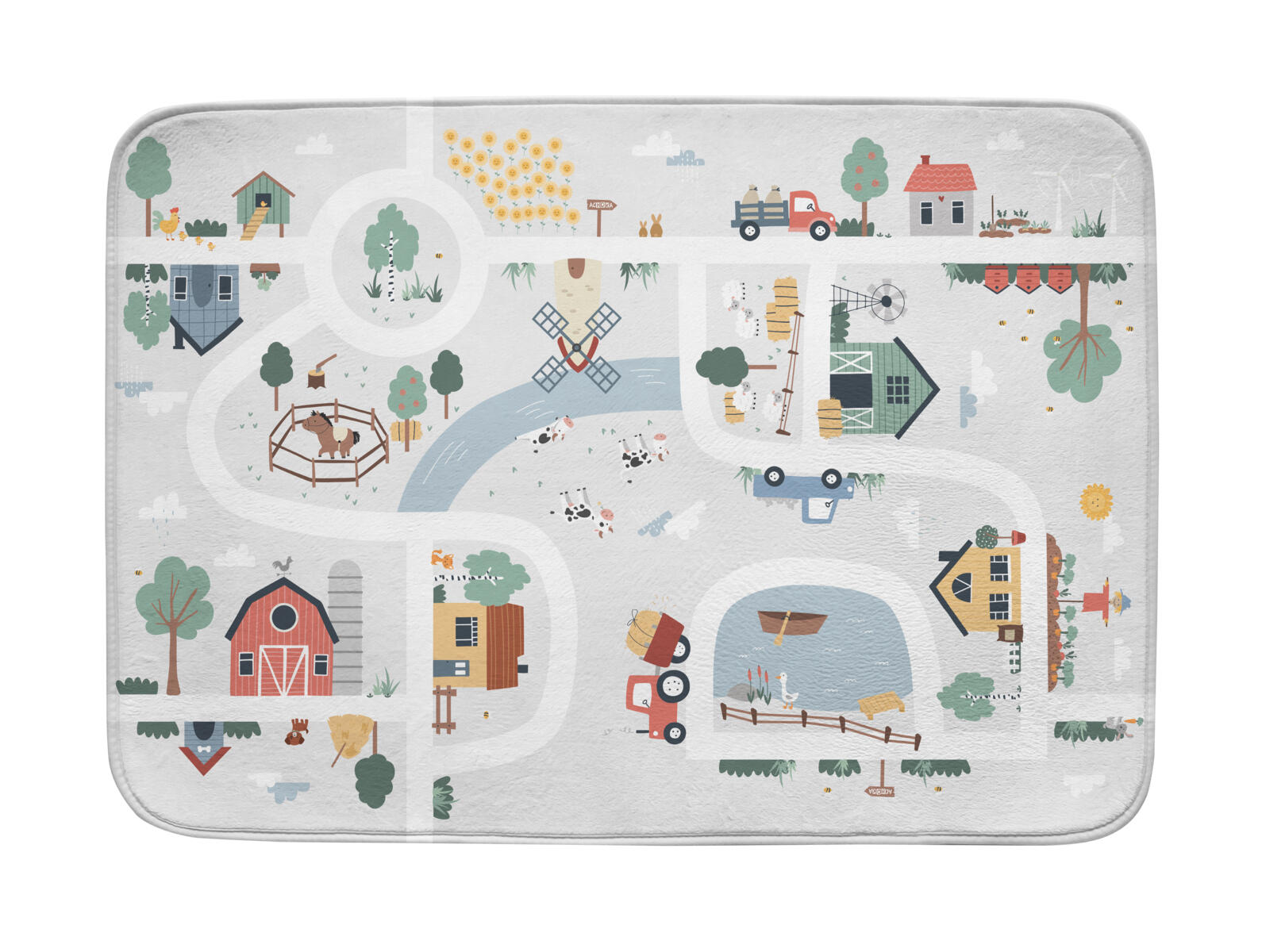 En härlig bondgårdsmatta som inspirerar till lek med djur, bilar och figurer. Genom en speciell vävteknik får mattan en annorlunda ytstruktur med 3-dimensionell effekt. Av polyester och bomull. Räfflad undersida, ej antiglid. Djur och tillbehör ingår ej. PVC-fri.