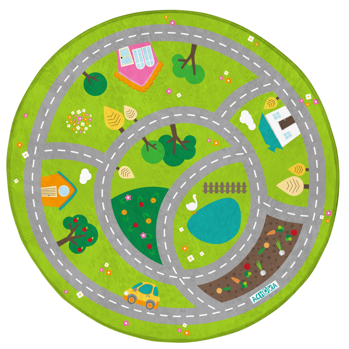 En stor matta där det finns plats för mycket fordonslek och flera barn kan leka samtidigt. Av 100 % nylon, gummerad undersida av latex. Rengöres via dammsugning, fläckar tas bort med milt rengöringsmedel och blöt trasa. PVC-fri.