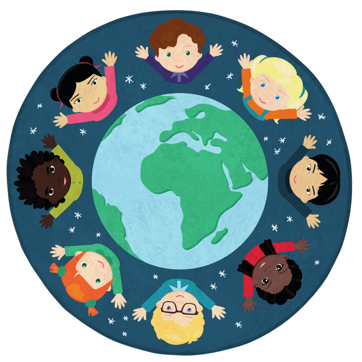 Med en färgglad och barnvänlig design uppmuntras barnen till diskussion om etnicitet och kultur. Gummerad halkfri undersida. Mått: ø 200 cm. Extra tjock lugg i tuftad nylon. PVC-fri.