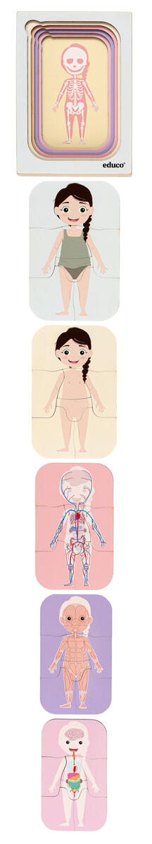 24 bitar. Pussel i 6 lager. Motivet visar människokroppen: skelettet, organen, musklerna och blodcirkulationen. Mått: 20,5x34 cm. AV FSC-märkt trä. PVC-fri. Från 4 år.