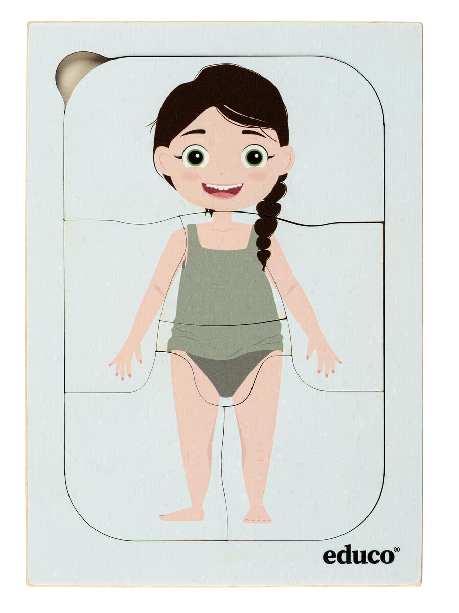 Lär känna kroppens delar. Pussel med stansade bitar i olika former för att träna barnens motoriska färdigheter. Bitarnas form återfinns även i pusselramen för att barnen lättare ska hitta dess plats. Tjocka och solida bitar av kraftig FSC-märkt återvunnen kartong. PVC-fri. Från 6 år.