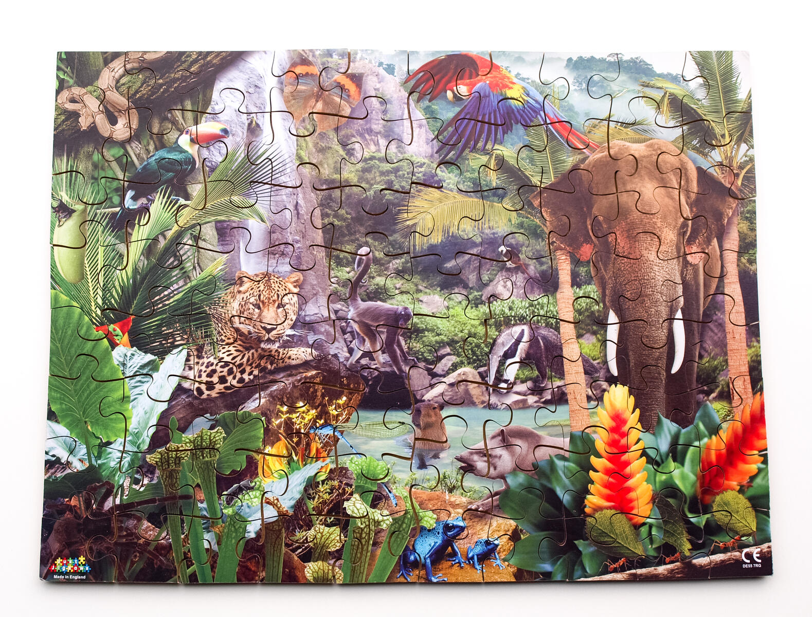200 bitar. Detaljrikt och färgstarkt pussel om djurlivet i djungeln med motiv på ett stort antal djur som leopard, elefant, panter och papegojor. Av kraftig kartong. PVC-fri. Från 8 år.