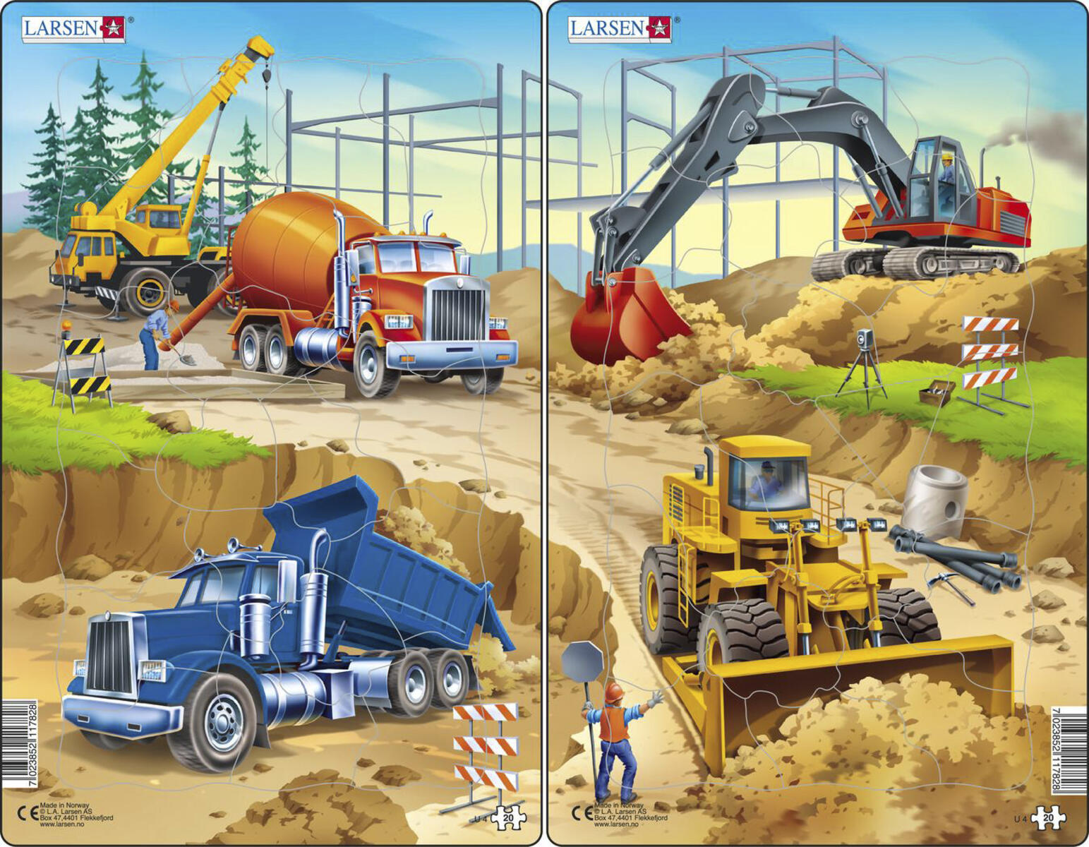 2 st/fp. 20 bitar/pussel. Färgstarka pussel med stansade bitar i olika former. Bitarnas form återfinns även i pusselramen för att barnen lättare ska hitta rätt plats. Tjocka och solida bitar av kraftig FSC-märkt återvunnen kartong. Mått: 28,5x18,3 cm. PVC-fri. Från 3 år.