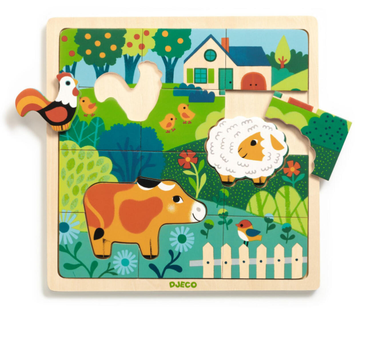 15 pusselbitar i ram. Härligt bondgårdspussel tillverkat i trä med härliga färger och fint motiv. Pusslet innehåller 3 djur-formade bitar och 12 vanliga bitar. Mått: 25x25x1 cm. Från 3 år.