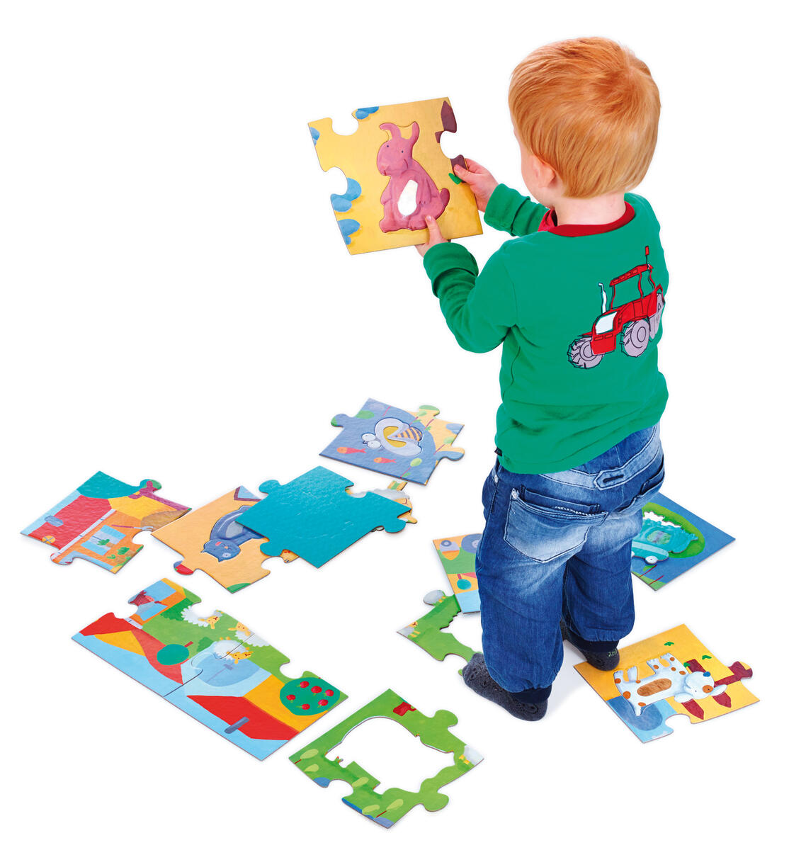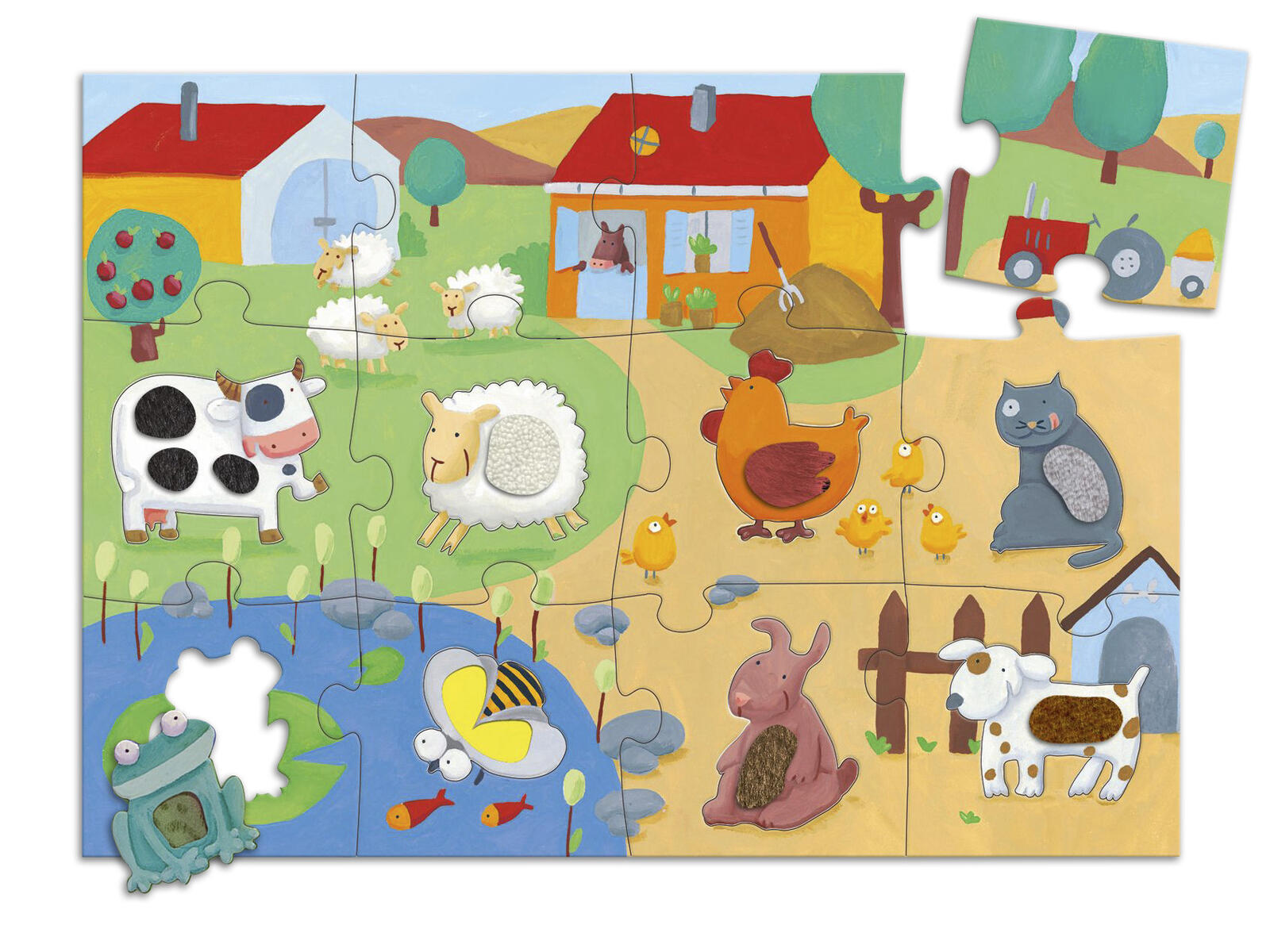 Stort känselpussel med motiv av 8 st olika bondgårdsdjur. Alla djur har olika ytstruktur som barnen kan lägga på rätt plats inuti pusslet och sedan upptäcka med känseln. Bitar av kraftig kartong. PVC-fri. Från 3 år.