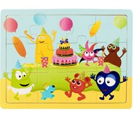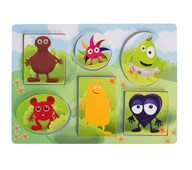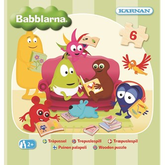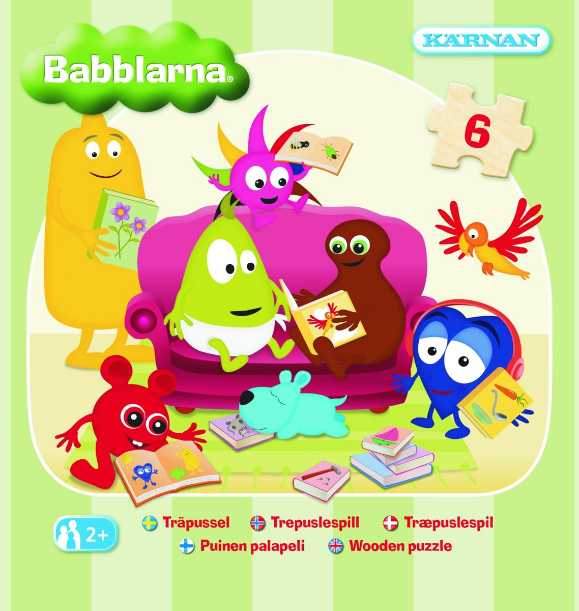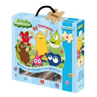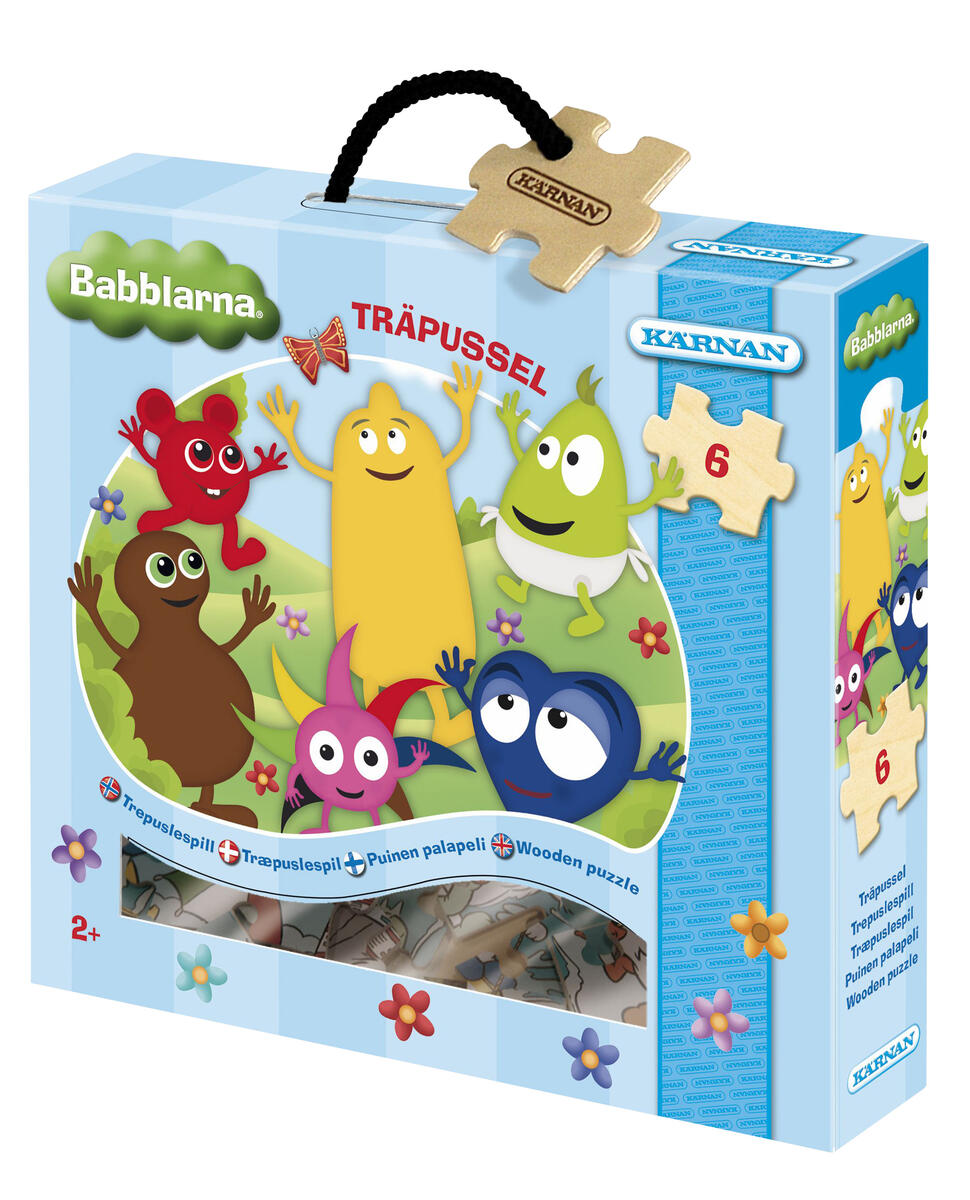 Formpussel med de sex figurerna Babblarna Babba, Bibbi, Bobbo, Dadda, Diddi och Doddo. När du lyfter pusselbitarna står varje Babblares namn i botten på pusslet. PVC-fri. 1–3 år.