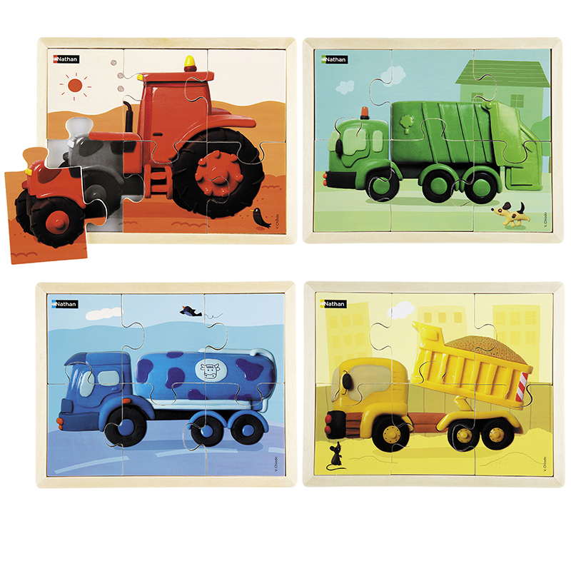4 st/fp. Färgglada och detaljrika rampussel med motiv av en dumper, tankbil, sopbil och traktor. 6 bitar/pussel. Varje pussel har motivet tryckt på ett underlägg, som man kan välja att lägga efter om det känns svårt. Av FSC-märkt trä. PVC-fri. Från 2 år.