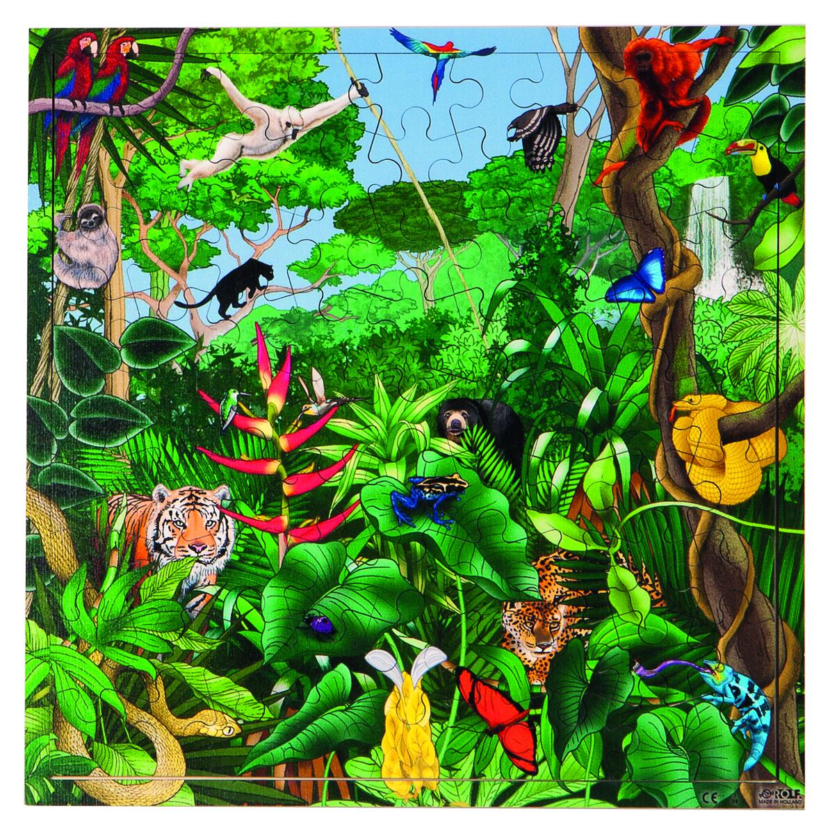 81 bitar. Ett fint rampussel som visar livet i regnskogen. Till pusslet finns en app som heter "Rolf AR Landscapes" utan kostnad, vilken väcker djuren till liv genom att zooma in dem. Av massivt trä i björk. PVC-fri. Rekommenderad från 5 år.