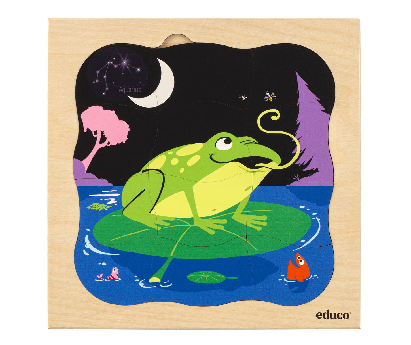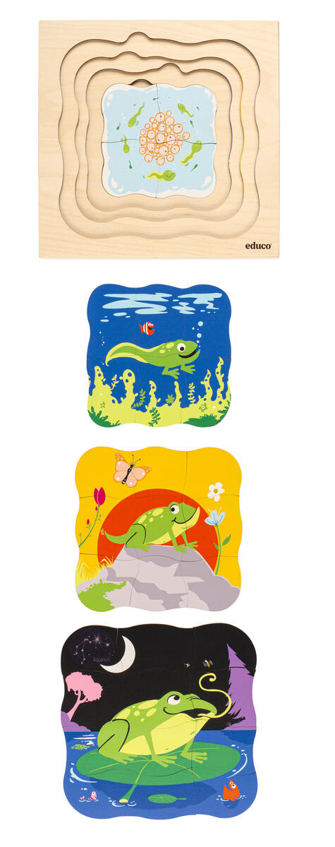 5 bitar. Träpussel i form av en groda. Varje pusselbit har en knopp. Utvecklar barnets intresse och kunskap kring zoologi. Lär ut grodans delar. Från 4 år.