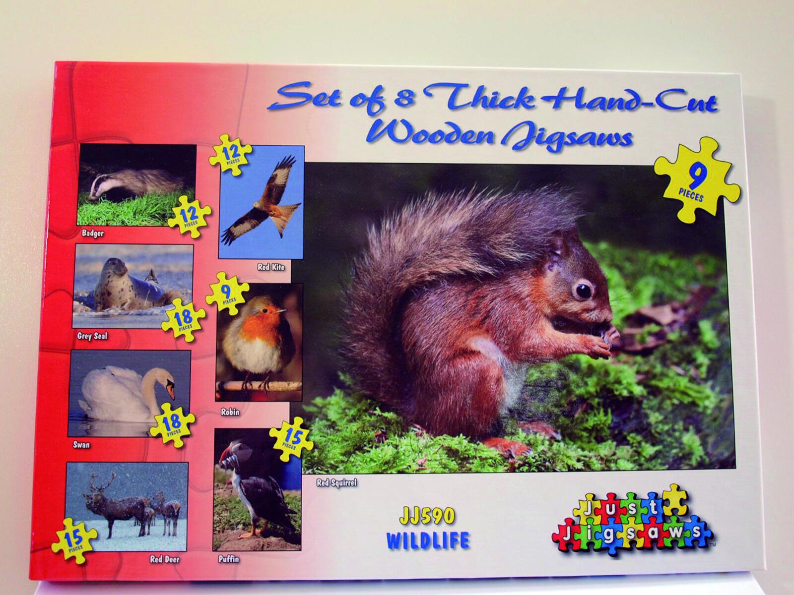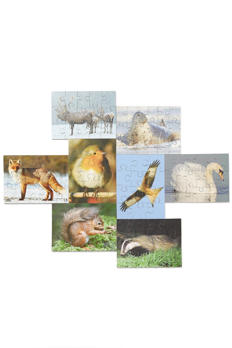 Pussla några av våra nordiska djur. Innehåller 8 pussel i trä med motiv av räv, säl, grävling, rödhake, hjort, svan, glada och ekorre. 9-18 handsågade bitar per pussel. Av FSC-märkt trä. PVC-fri. Från 3 år.
