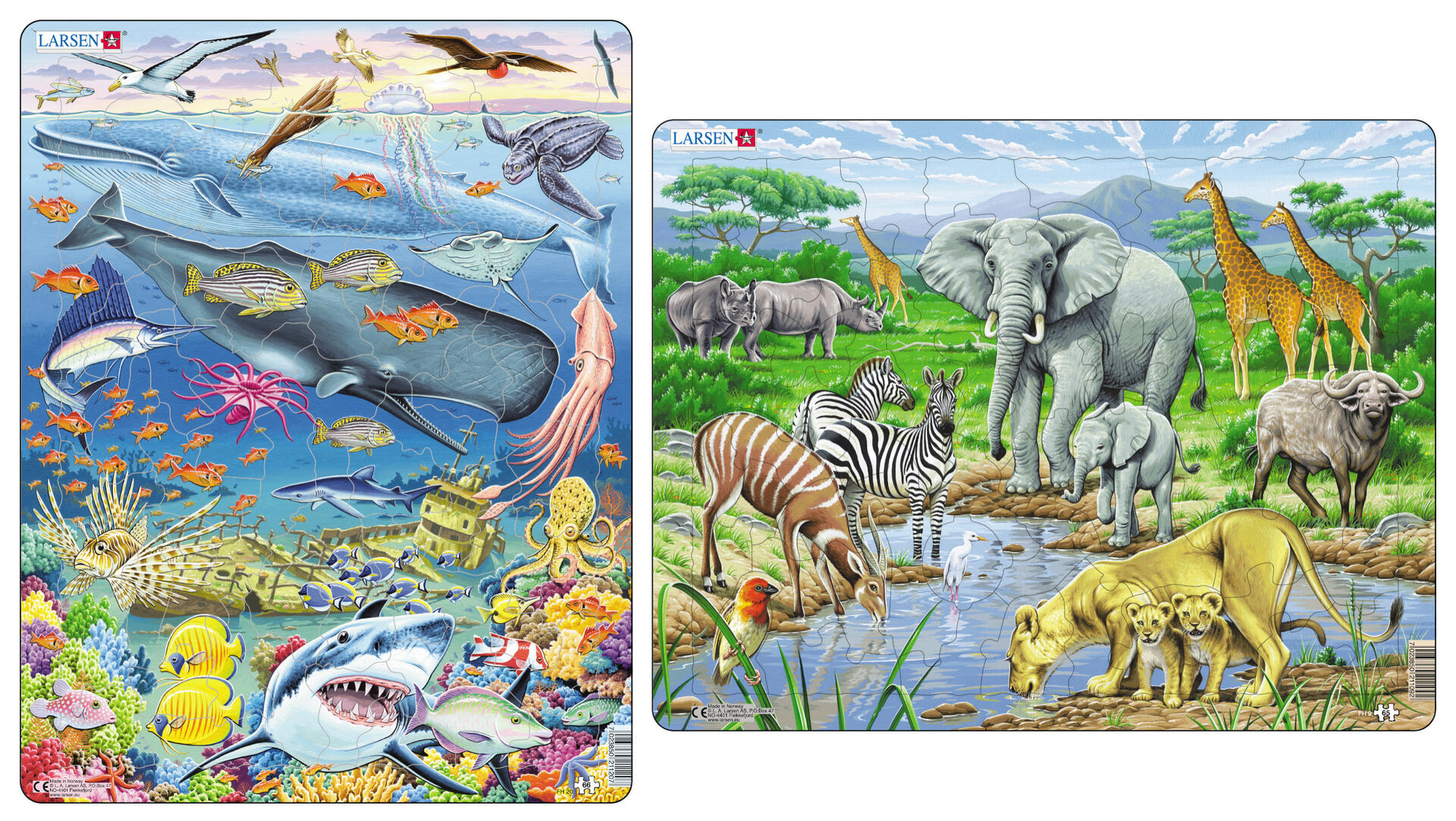 Detaljrika pussel med stansade bitar som får formen som ett djur och andra kända karaktärer. Bitarnas form återfinns även i pusselramen för att barnen lättare ska hitta dess plats. Tjocka och solida bitar av kraftig FSC-märkt återvunnen kartong. 65 resp 66 bitar. PVC-fri. Från 3 år.