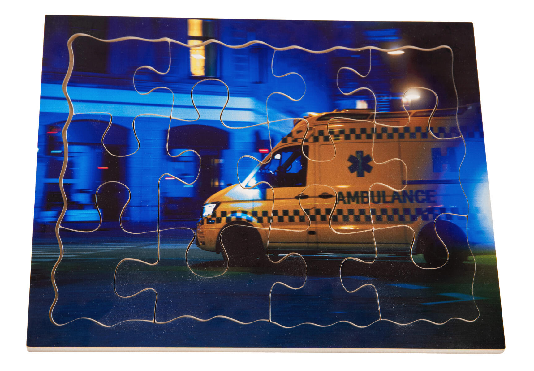 2 pussel/fp. 12 handsågade bitar per pussel. Ett med fotografiskt motiv av polismotorcykel och ett med ambulans. Mått: 30x20 cm. Av FSC-märkt trä. PVC-fri. Från 3 år.