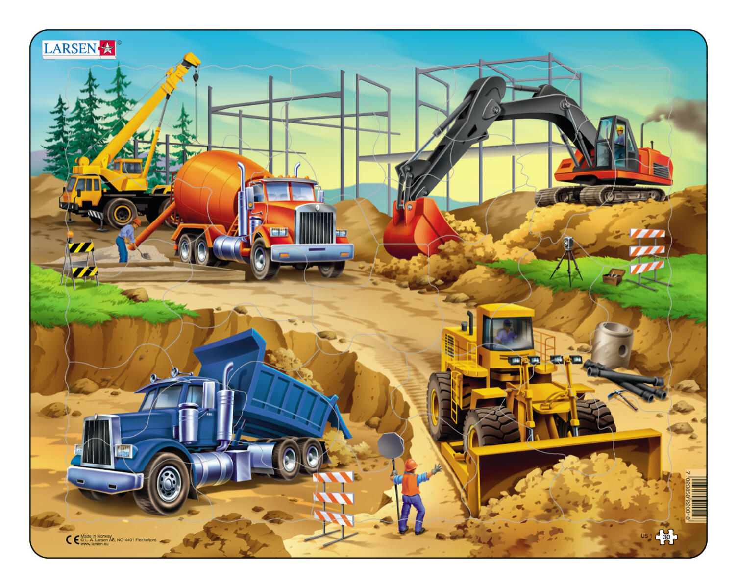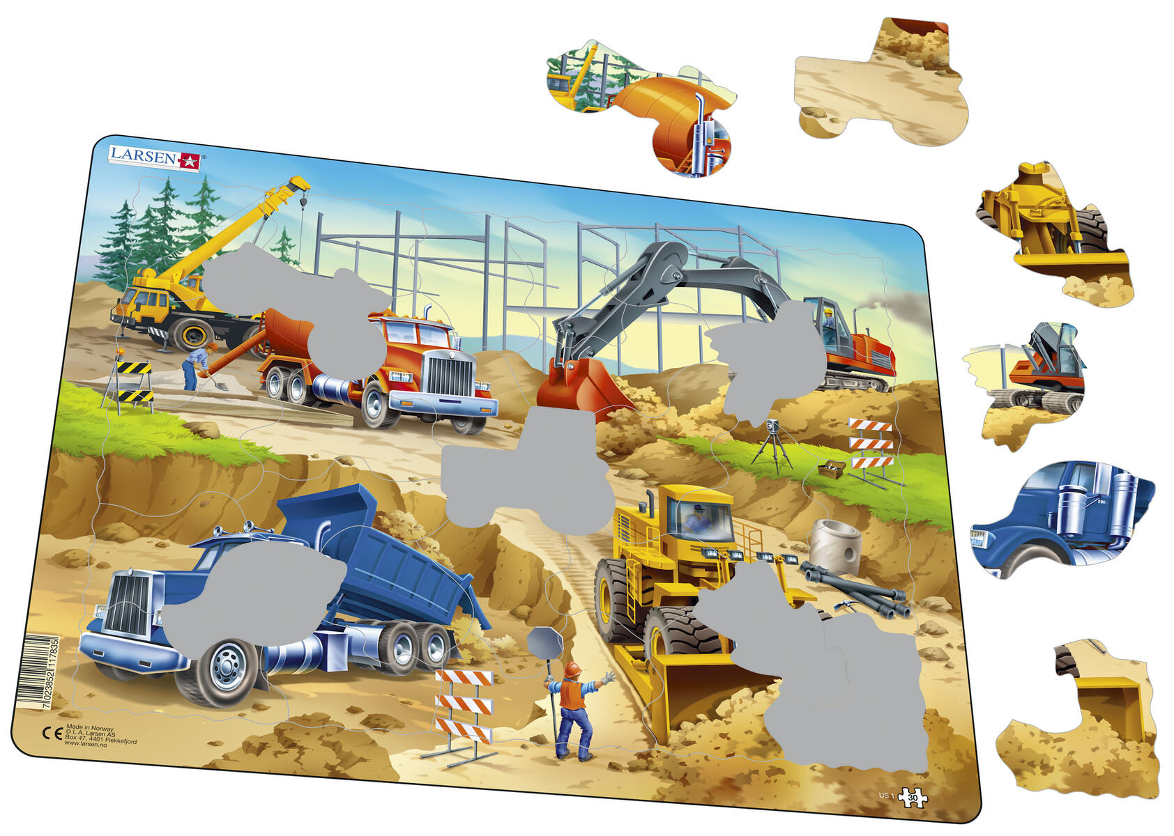 7 bitar. Greppvänligt pussel för de minsta barnen. Motiv med fordonen på en arbetsplats. Lyfter man på en bit ser man en bild av samma bit undertill som gör det enklare för barnen att lägga rätt bit på rätt plats. Av FSC-märkt trä. PVC-fri. Från 2 år.