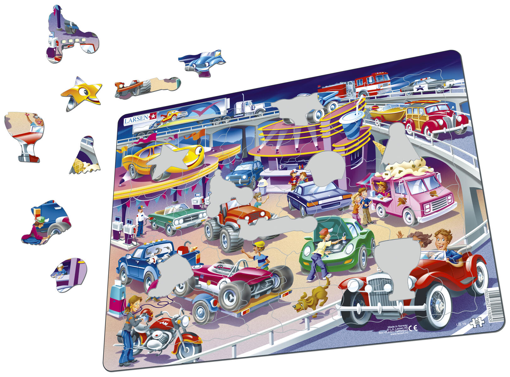 58 bitar. Fantasifullt pussel med stansade bitar som får formen som ett djur och andra kända karaktärer. Bitarnas form återfinns även i pusselramen för att barnen lättare ska hitta dess plats. Tjocka och solida bitar av kraftig FSC-märkt återvunnen kartong. PVC-fri. Från 3 år.