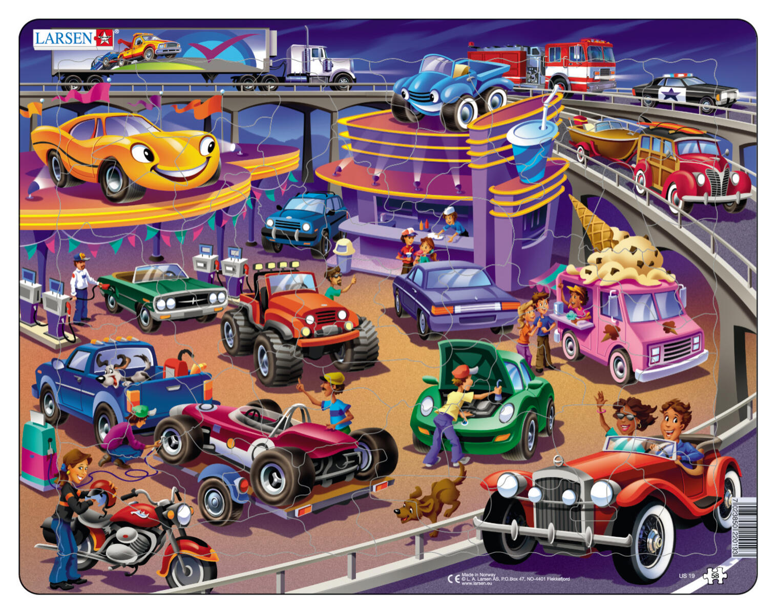 65 bitar. Detaljrikt pussel med stansade bitar som blir djur och andra kända karaktärer. Bitarnas form återfinns även i pusselramen för att barnen lättare ska hitta rätt plats. Tjocka och solida bitar av kraftig FSC-märkt återvunnen kartong. PVC-fri. Från 3 år.