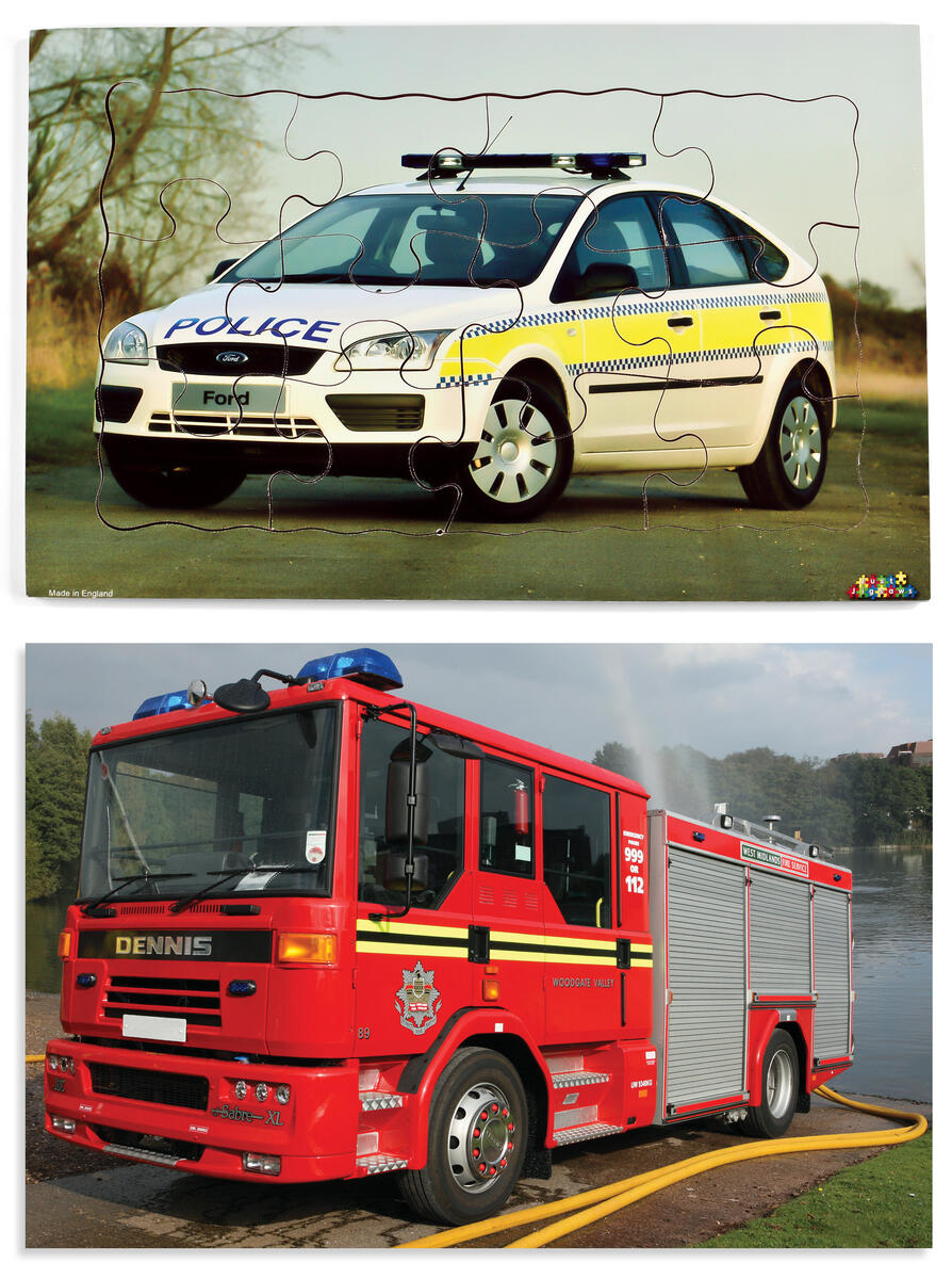 2 st/fp. Öva problemlösning, öga-hand-koordination och finmotorik med dessa rampussel föreställande en polisbil respektive brandbil. Pusslen kan användas av barn i både förskolan och skolan som ett diskussionsunderlag i ett tema eller projekt om utryckningsfordon, färger, funktion och mycket mer. Pusslen är screentryckta vilket ger skarpa och tydliga motiv. Tillverkade av FSC-märkt trä. Innehåller 12 handsågade bitar. PVC-fri. Från 3 år.