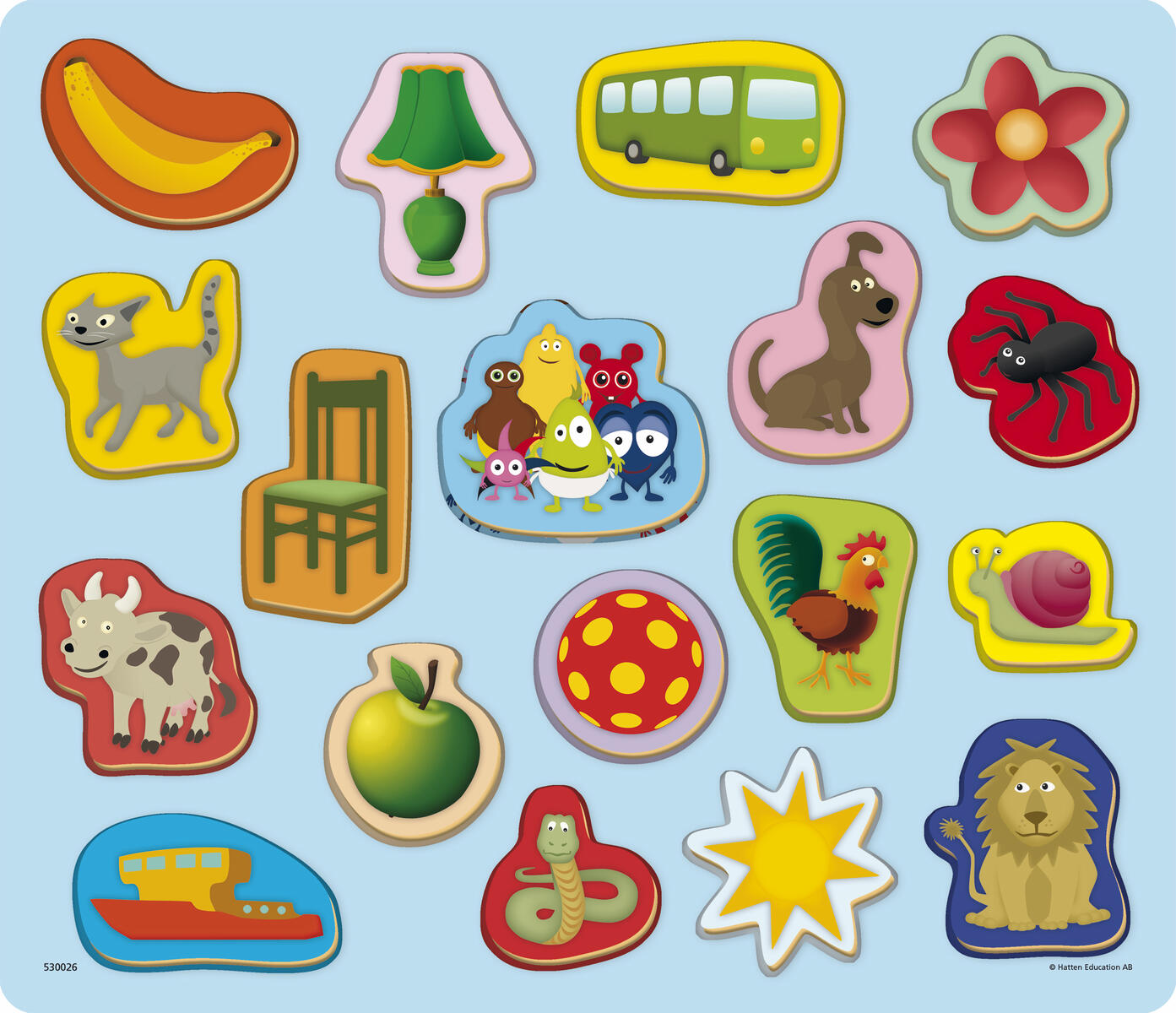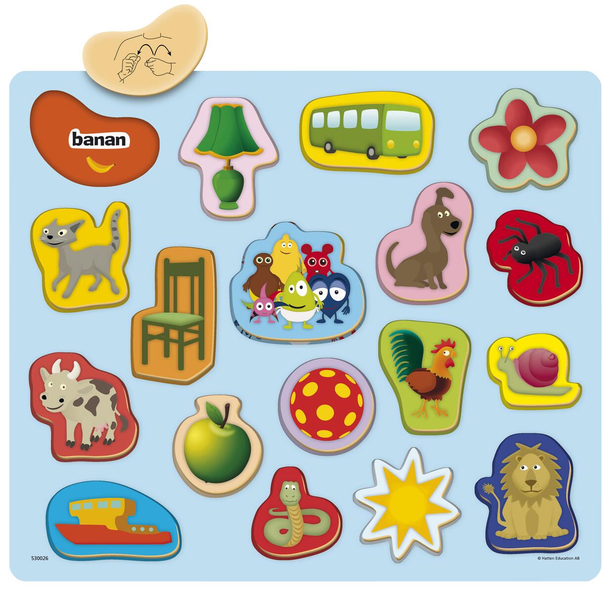 18 bitar. Det här är ett pussel som lär dig ord och att para ihop bilder. Varje pusselbit har ett motiv med en bakgrundsfärg. På baksidan av pusselbiten finns även en teckenspråksbild som visar hur motivet tecknas. På pusselplattan ska pusselbiten sen hitta sin plats och det gör den genom flera ledtrådar: man kan leta rätt form, rätt bakgrundsfärg eller titta på en miniatyr av motivet. Utöver det står ordet på motivet på rätt plats. Ingående råvara FSC-märkt. PVC-fri. Från 2 år.