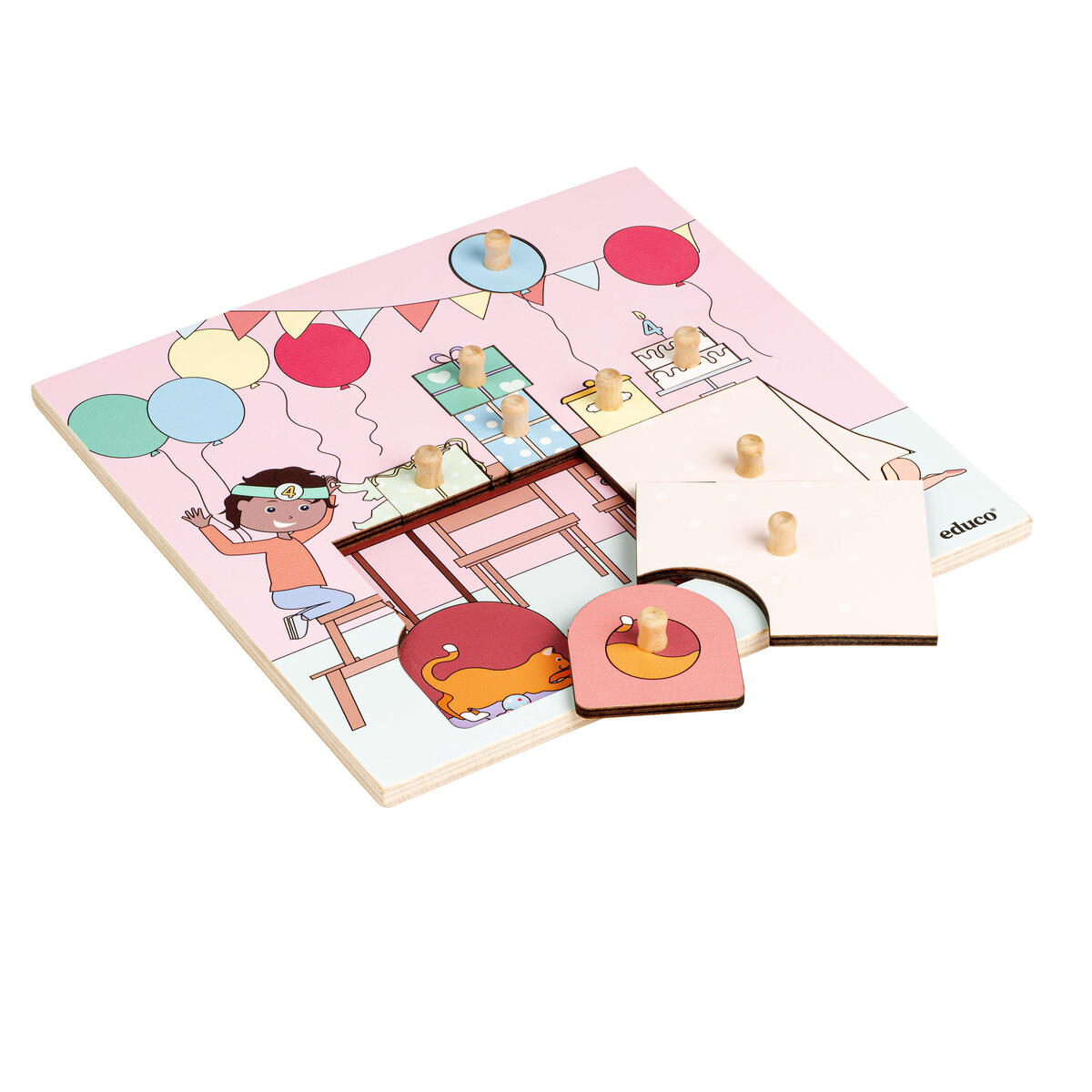 8 bitar. Lyft en pusselbit och upptäck att något är dolt. Namnge och berätta vad du ser. Motiv av olika föremål som återfinns i vardagen. Mått: 28x28 cm. Av FSC-märkt trä. PVC-fri. Från 3 år.