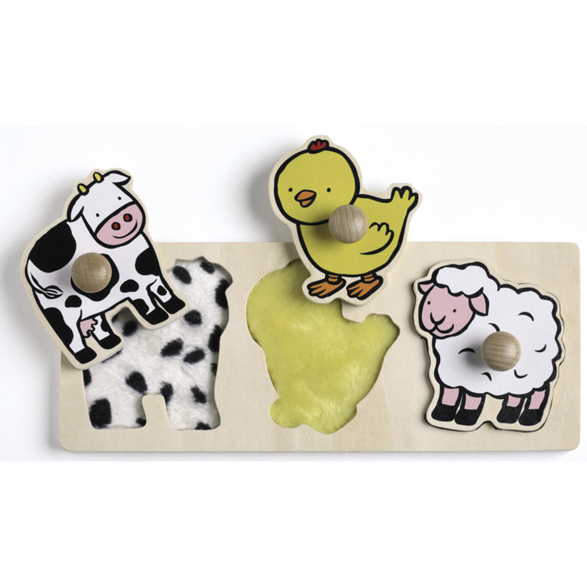 Stort känselpussel med motiv av 8 st olika bondgårdsdjur. Alla djur har olika ytstruktur som barnen kan lägga på rätt plats inuti pusslet och sedan upptäcka med känseln. Bitar av kraftig kartong. PVC-fri. Från 3 år.