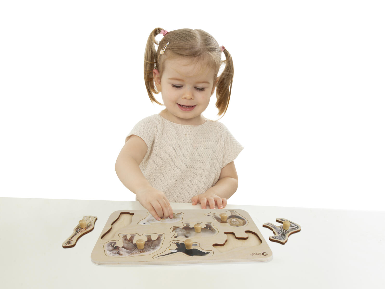 9 bitar. Ett knoppussel av trä där de yngre barnen kan träna sig på att namnge klädesplagg och prata om var på kroppen man har detta plagg. Av FSC-märkt trä. PVC-fri. Från 1 år.