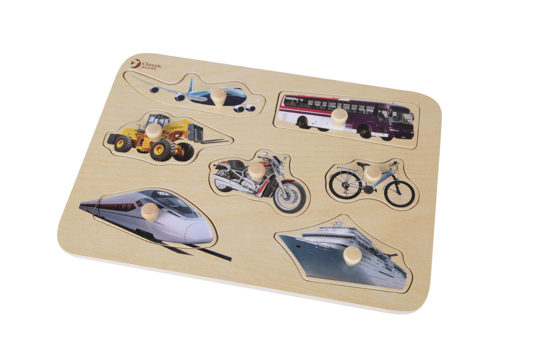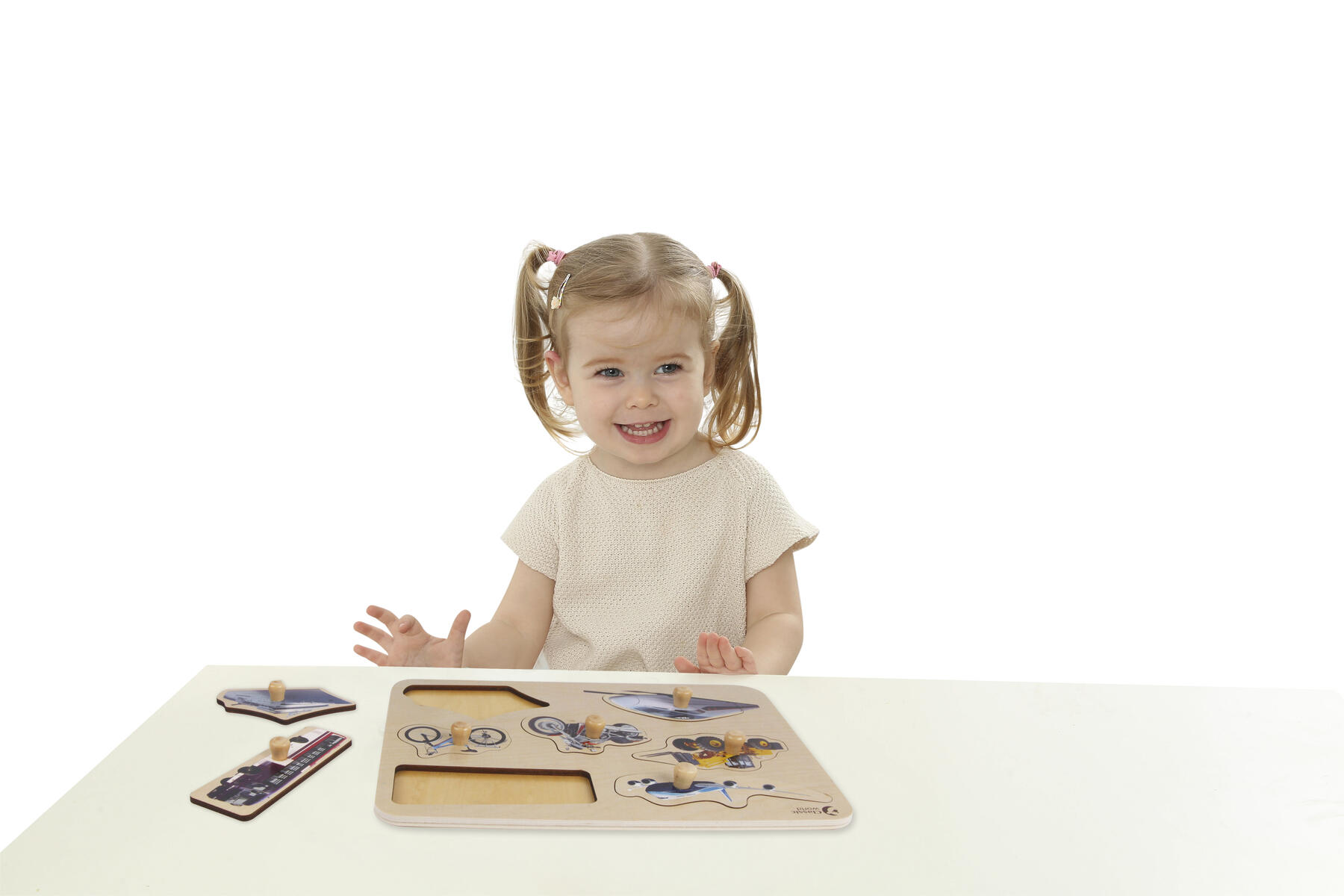 7 bitar. Greppvänligt pussel för de minsta barnen. Motiv med fordonen på en arbetsplats. Lyfter man på en bit ser man en bild av samma bit undertill som gör det enklare för barnen att lägga rätt bit på rätt plats. Av FSC-märkt trä. PVC-fri. Från 2 år.