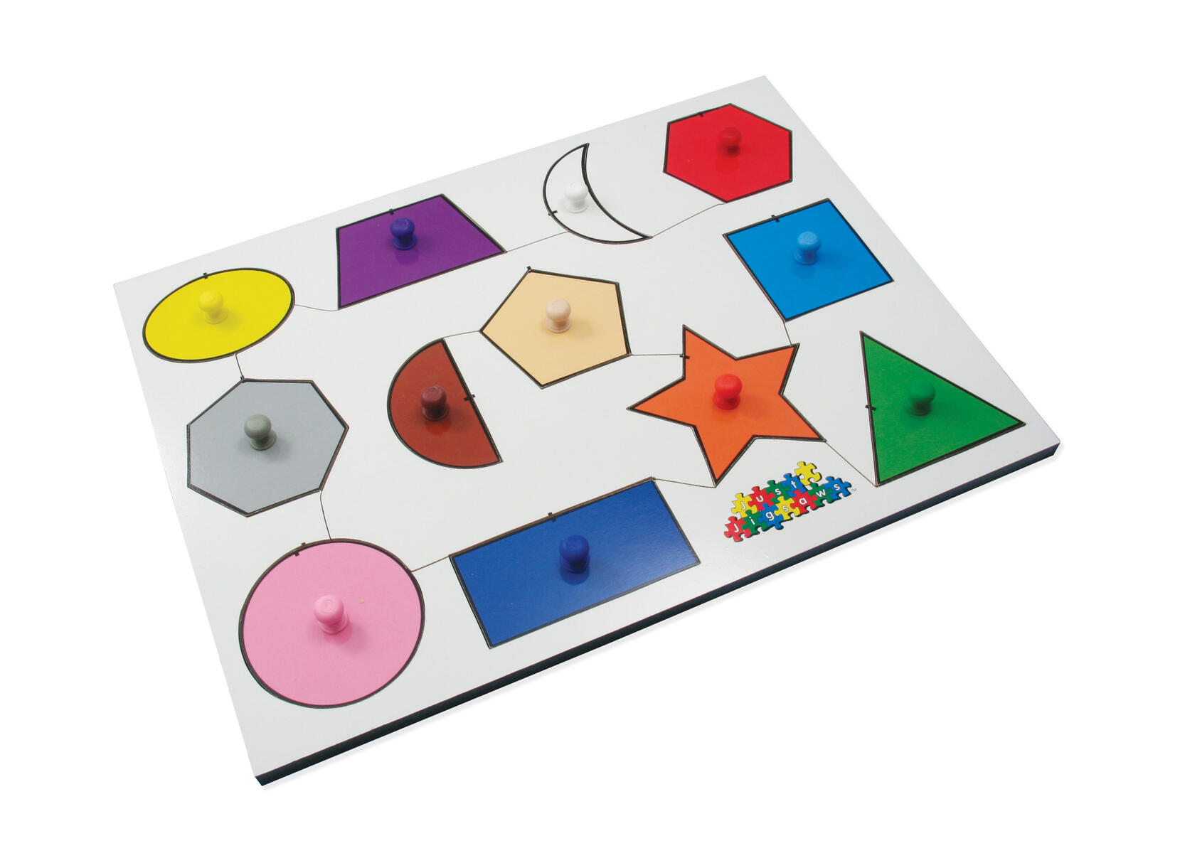 6 bitar. Ett knoppussel där de yngre barnen kan lära sig att känna igen former, färger och antal hörn på formerna. Lyfter man på en form så ser man exempelvis siffran för det antal hörn som formen har. Av FSC-märkt trä. Mått: 30x18 cm. PVC-fri. Från 2 år.
