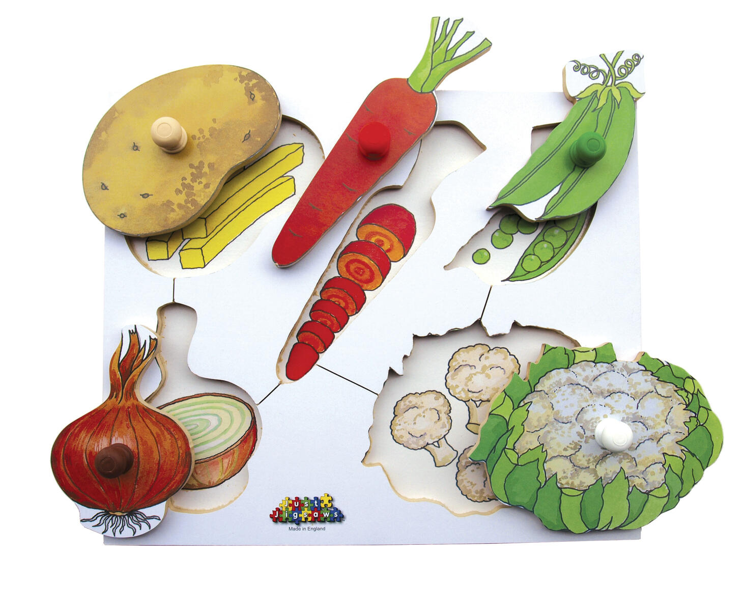 5 bitar. Roligt och pedagogiskt knoppussel med grönsaker som visar vad som finns inuti när man lyfter på pusselbiten. Av FSC-märkt trä. PVC-fri. Från 1 år.