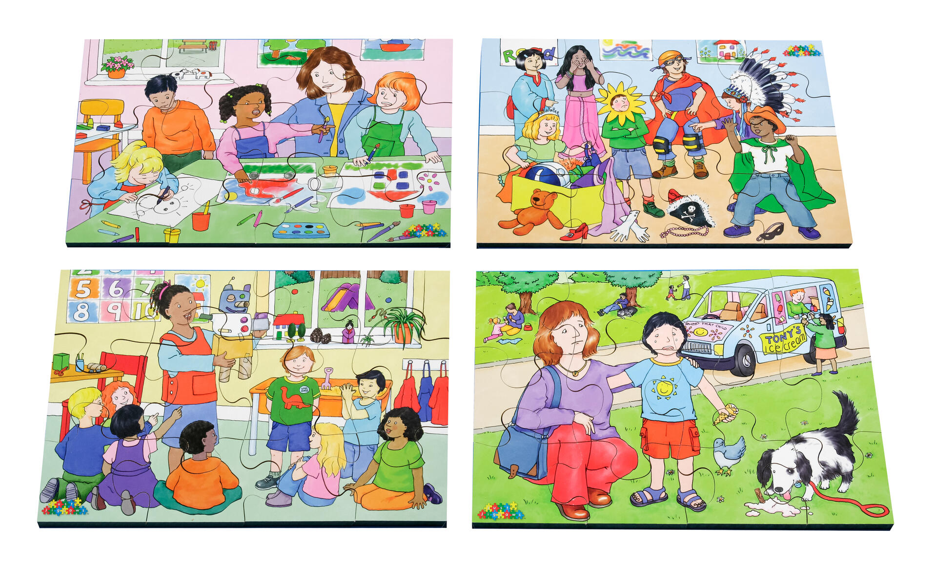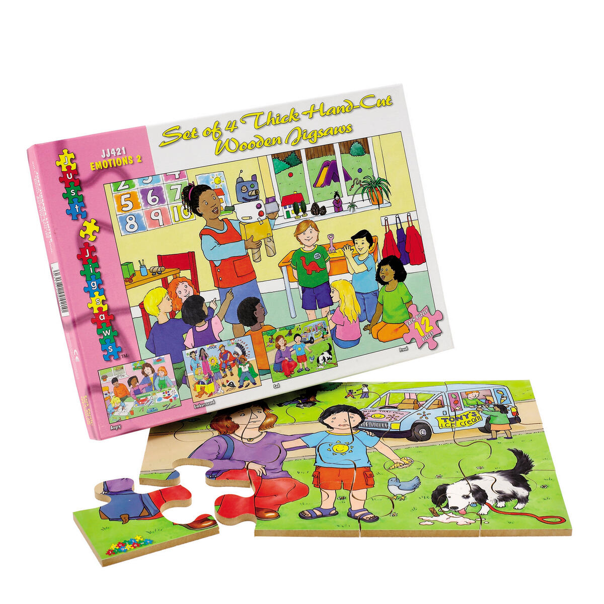 4 träpussel med 12 handsågade bitar i varje. Motiven visar händelser med olika känslor. Bra tillfälle att prata med barn om hur andra känner sig i olika situationer. Av FSC-märkt trä. PVC-fri. Från 3 år.