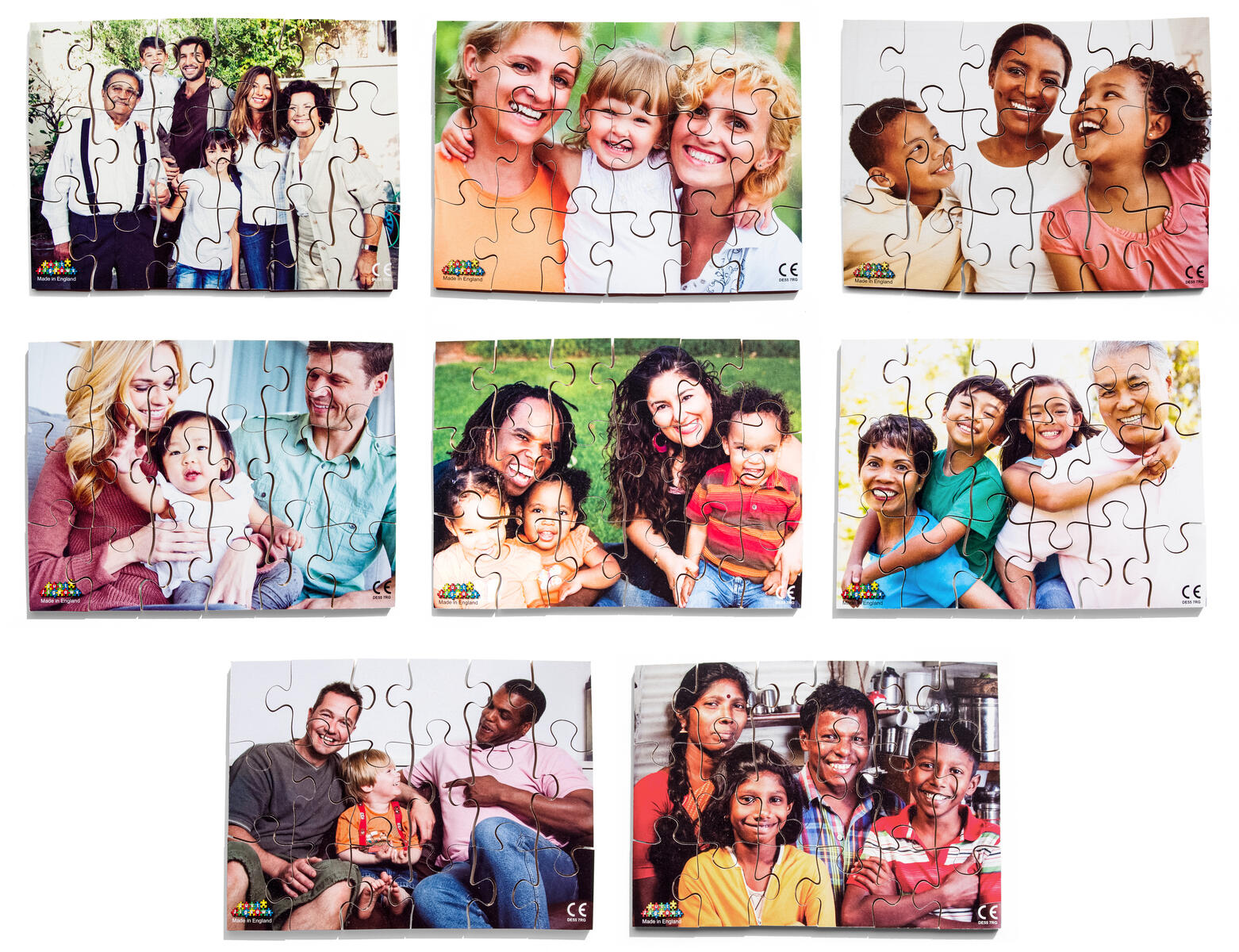 8 pedagogiska och rejäla träpussel med fotografiska motiv av olika familjer som speglar vårt samhälle. 18 handsågade bitar per pussel. Av FSC-märkt trä. PVC-fri. Från 3 år.