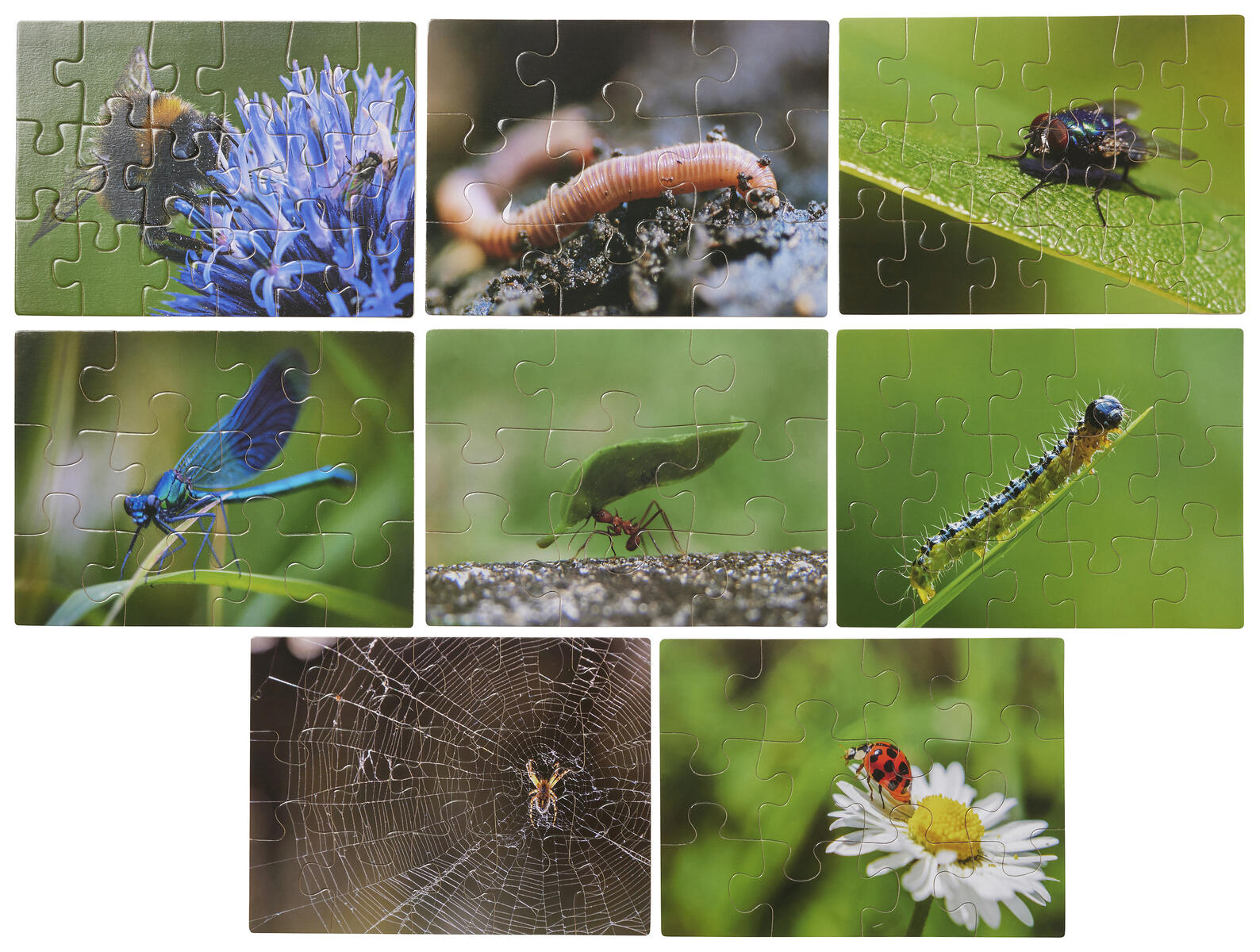 8 pussel med fina fotografiska bilder på de vanligaste insekterna i vår natur. Innehåller motiven myra, humla, tusenfoting, nyckelpiga, fluga, spindel, daggmask och trollslända. 9–18 bitar. Av FSC-märkt trä. PVC-fri. Från 3 år.