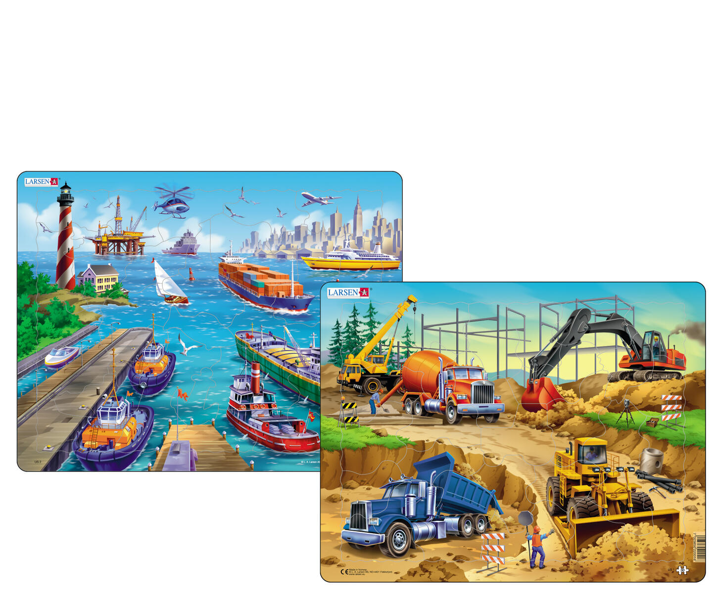 Färgstarka pussel med stansade bitar som får formen som ett djur och andra kända karaktärer. Bitarnas form återfinns även i pusselramen för att barnen lättare ska hitta dess plats. Tjocka och solida bitar av kraftig FSC-märkt återvunnen kartong. 50 resp. 58 bitar. PVC-fri. Från 3 år.